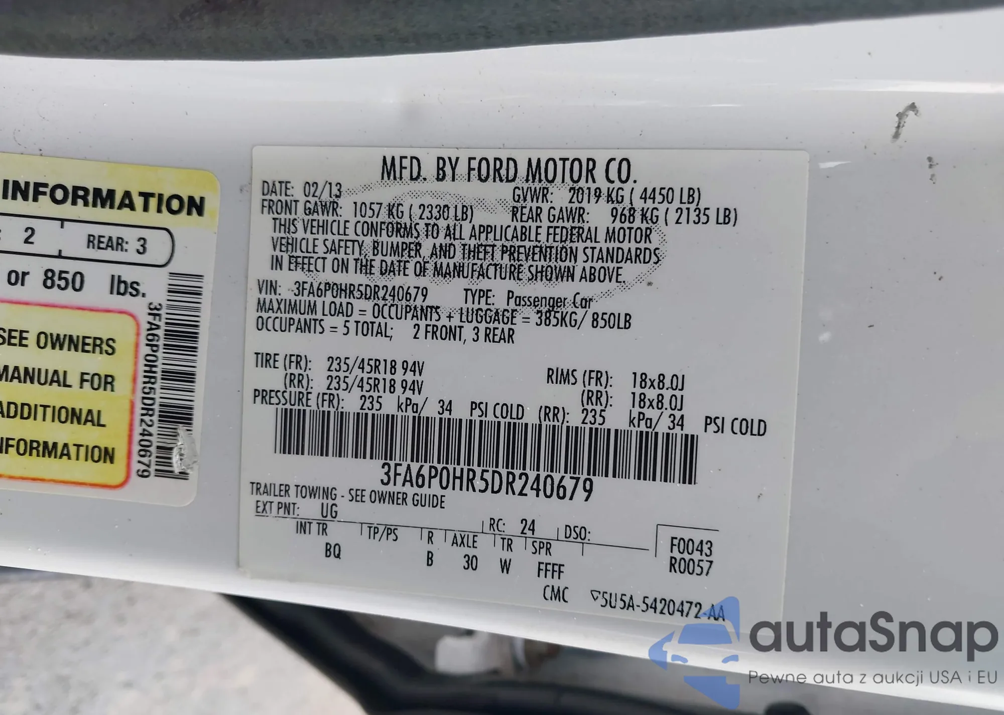 Samochód Ford Fusion 2013 (VIN 3FA6P0HR5DR240679) nie był wcześniej licytowany. Dokumenty są czyste, przebieg odpowiada lub jest niższy niż średnia rynku. Sprzedaje go firma ubezpieczeniowa – polecamy zakup. Dostawa do portu zajmie ok. 6–8 tygodni.