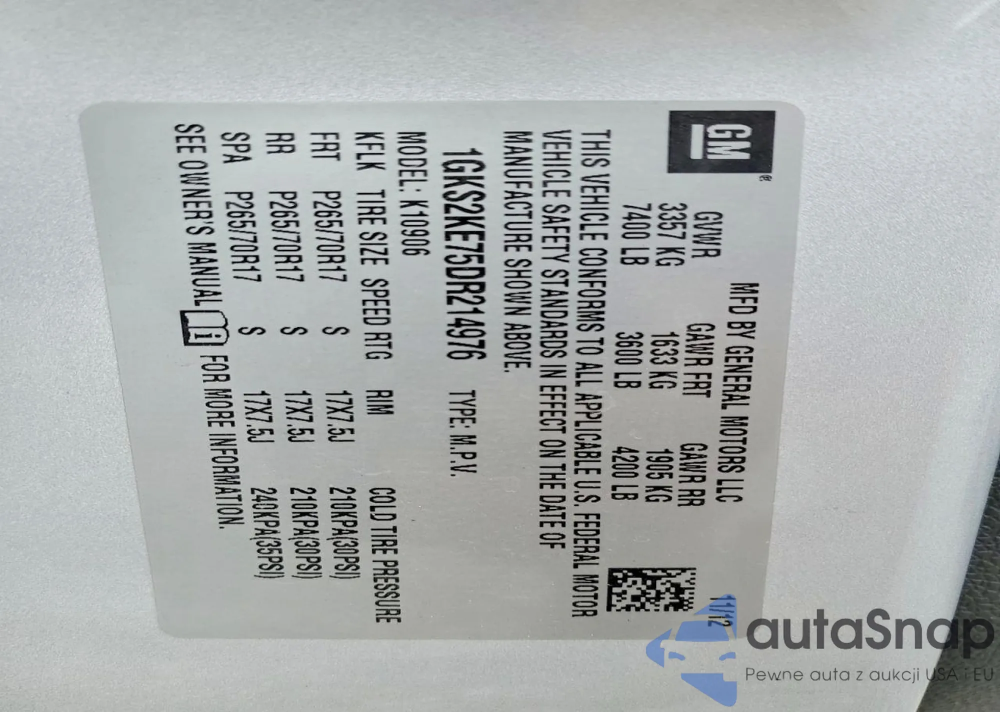 • VIN: 1GKS2KE75DR214976