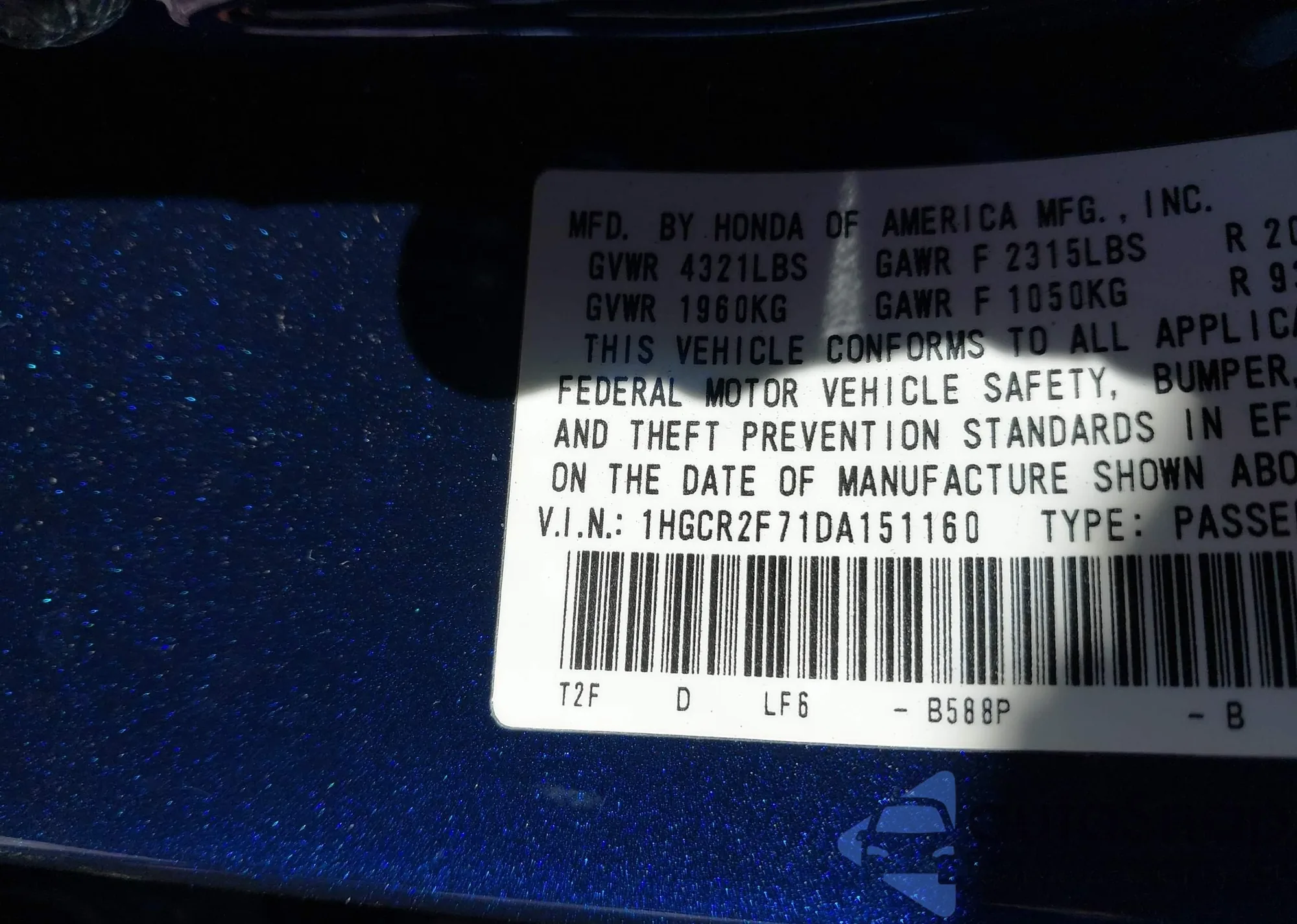 VIN: 1HGCR2F71DA151160