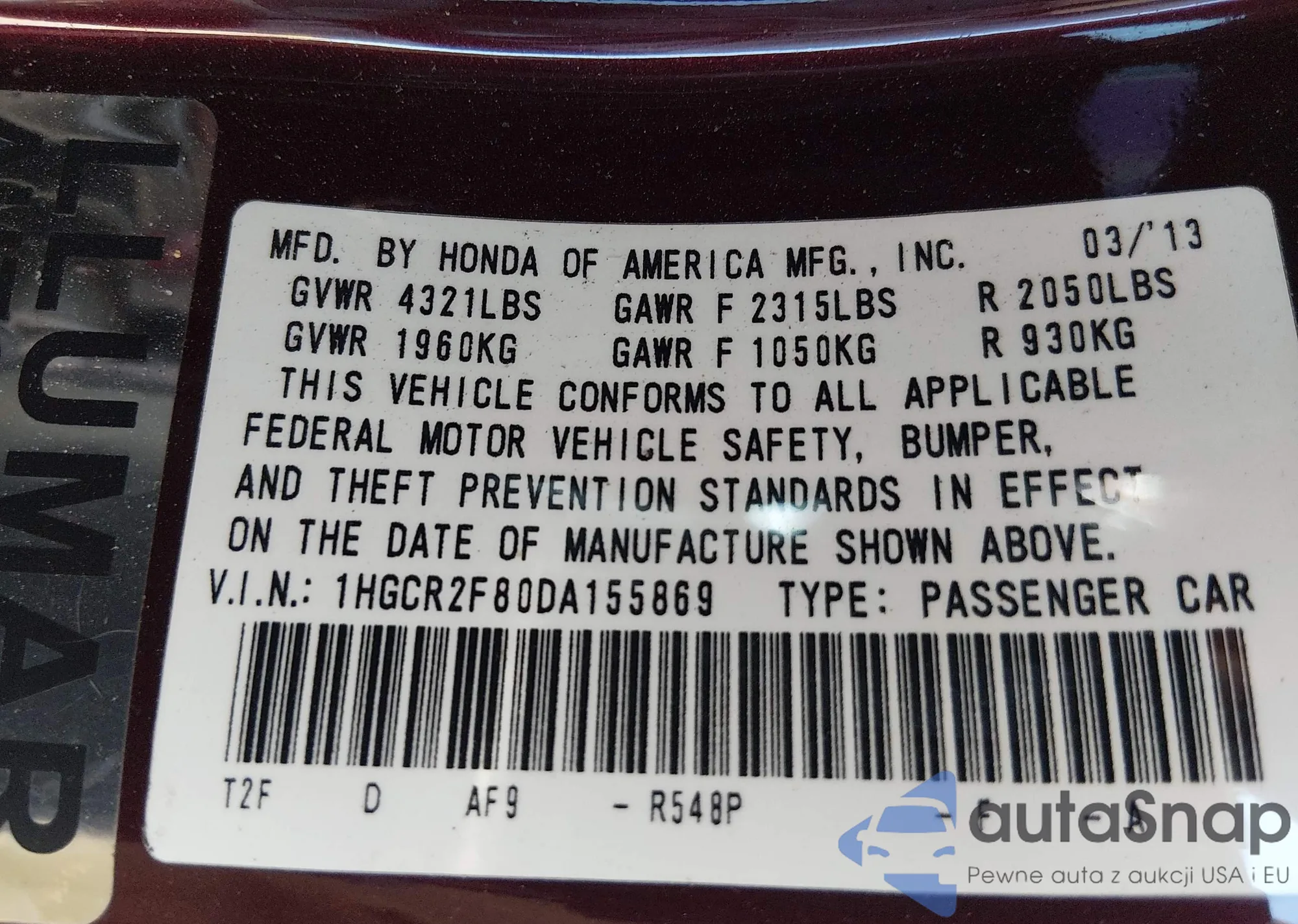 Samochód Honda Accord 2013 (VIN 1HGCR2F80DA155869) nie był wcześniej licytowany. Dokumenty są czyste, przebieg odpowiada lub jest niższy niż średnia rynku. Sprzedaje go firma ubezpieczeniowa – polecamy zakup. Dostawa do portu zajmie ok. 6–8 tygodni.