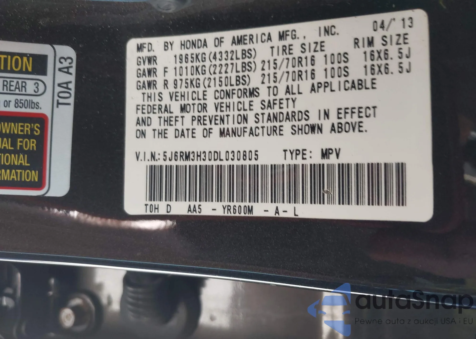 VIN: 5J6RM3H30DL030805