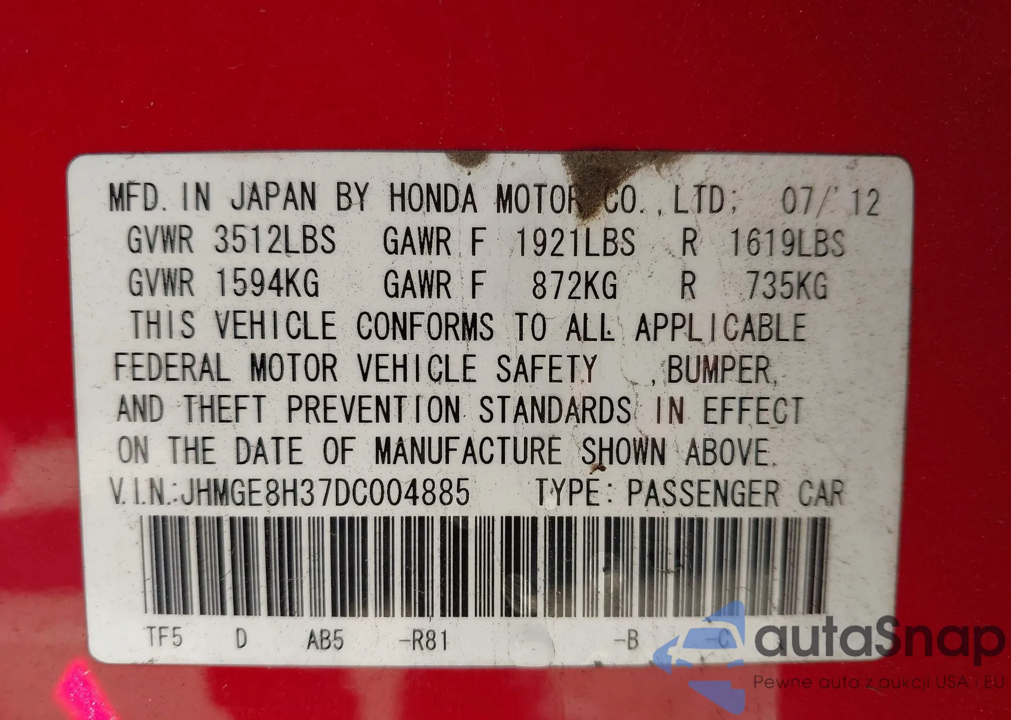 VIN: JHMGE8H37DC004885