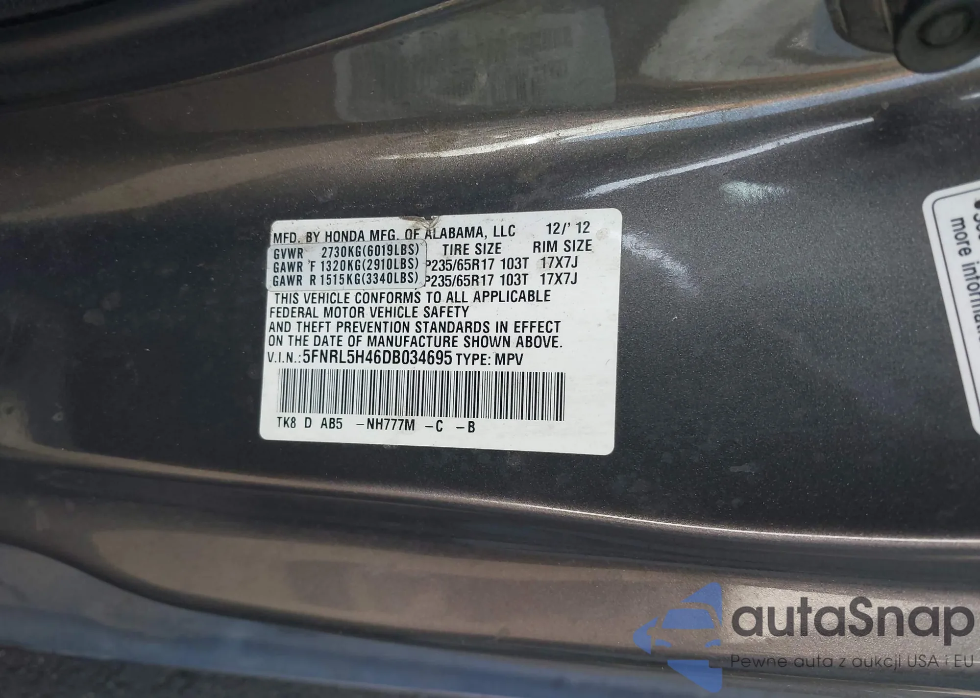 Samochód Honda Odyssey 2013 (VIN 5FNRL5H46DB034695) nie był wcześniej licytowany. Dokumenty są czyste, przebieg odpowiada lub jest niższy niż średnia rynku. Sprzedaje go firma ubezpieczeniowa – polecamy zakup. Dostawa do portu zajmie ok. 6–8 tygodni.