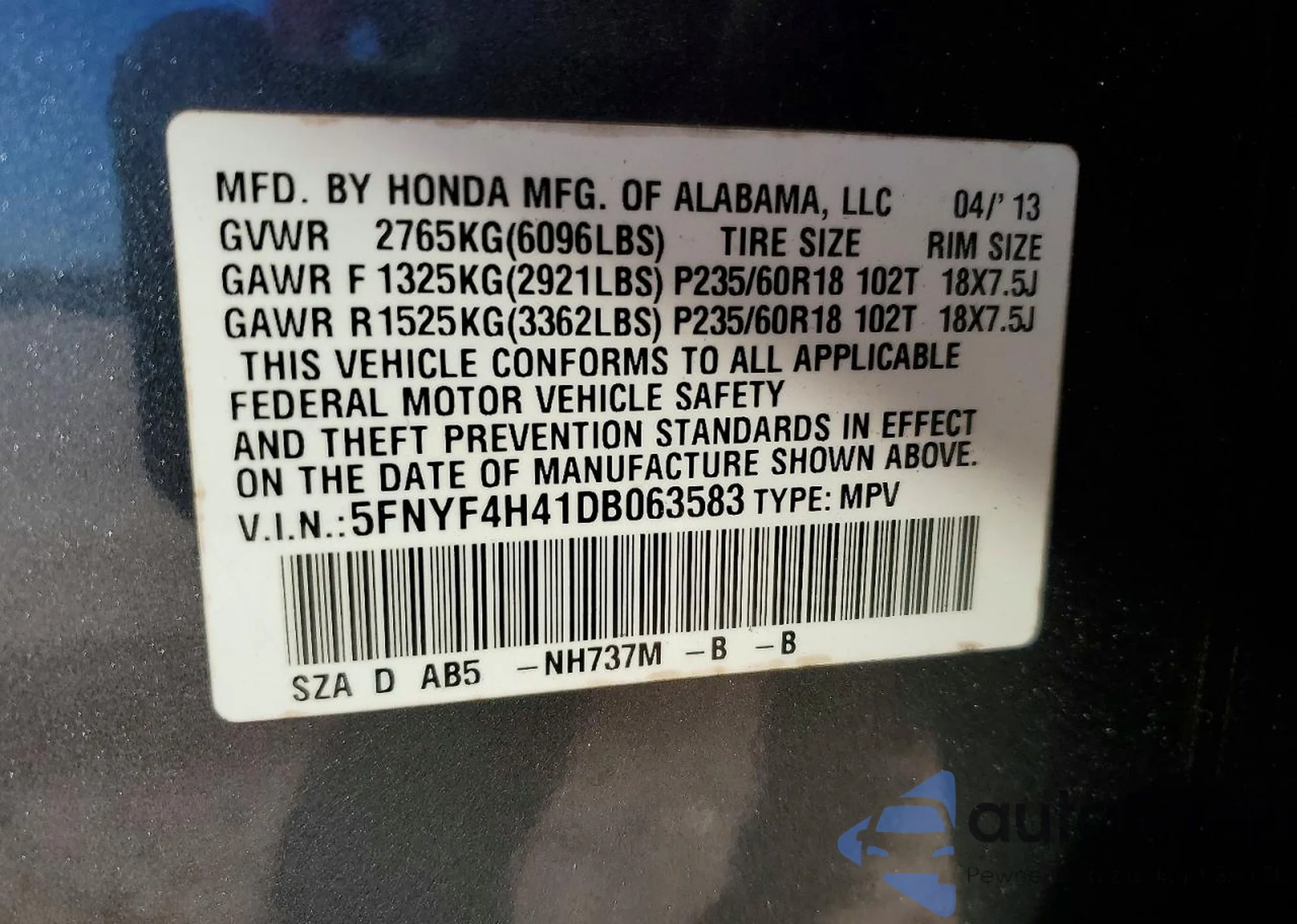 VIN: 5FNYF4H41DB063583