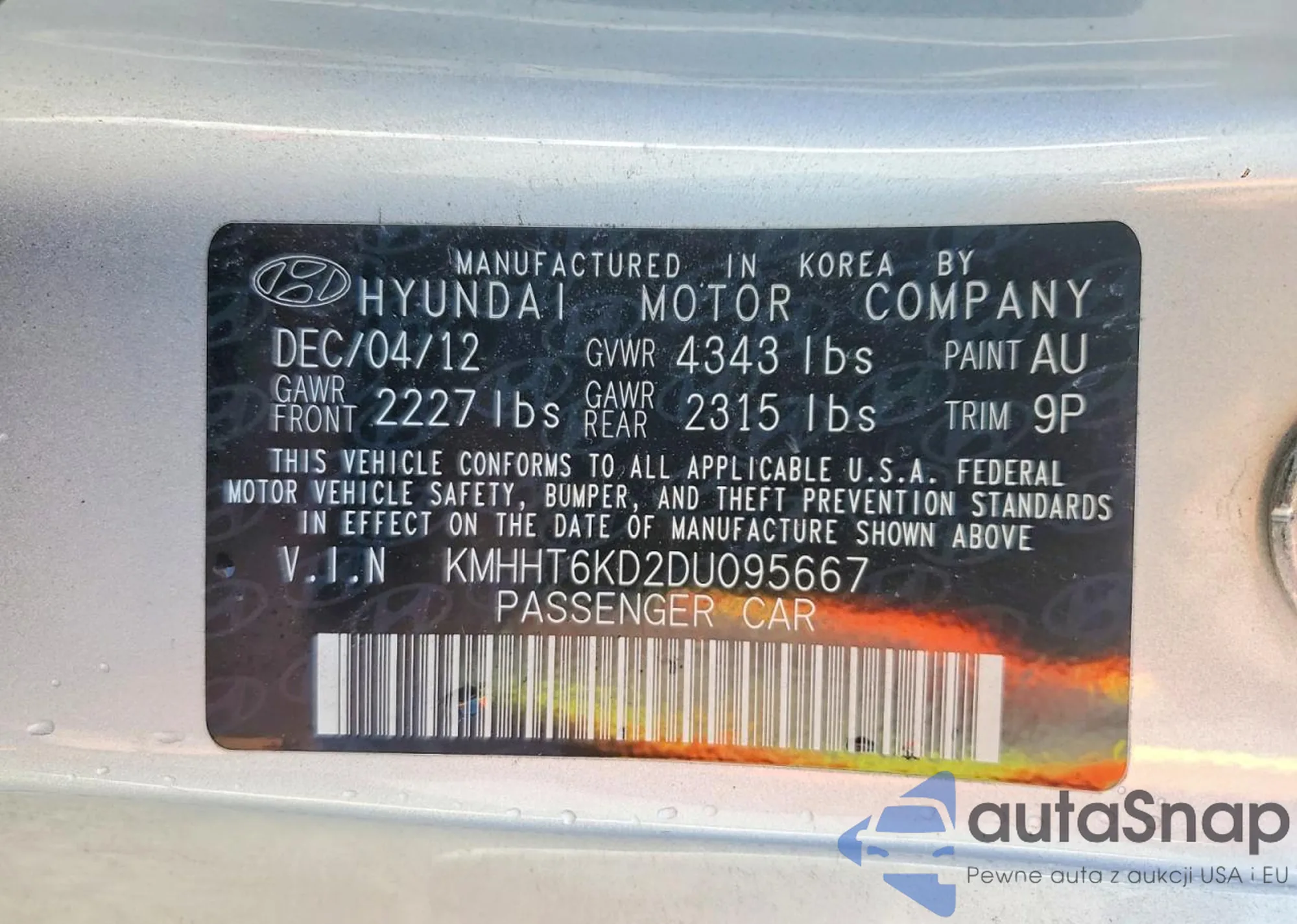 Samochód Hyundai Genesis Coupe 2013 (VIN KMHHT6KD2DU095667) nie był wcześniej licytowany. Dokumenty są czyste, przebieg odpowiada lub jest niższy niż średnia rynku. Sprzedaje go firma ubezpieczeniowa – polecamy zakup. Dostawa do portu zajmie ok. 6–8 tygodni.