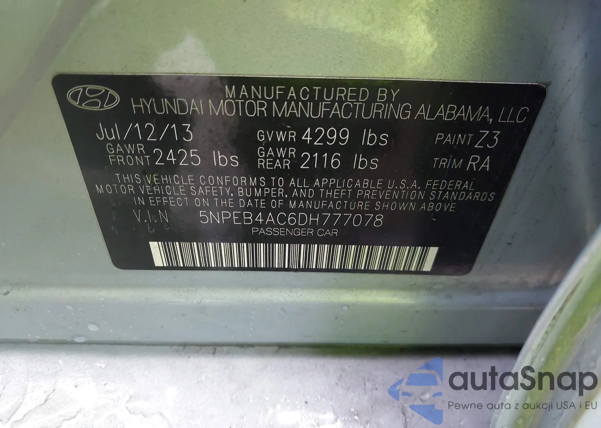 • VIN: 5NPEB4AC6DH777078