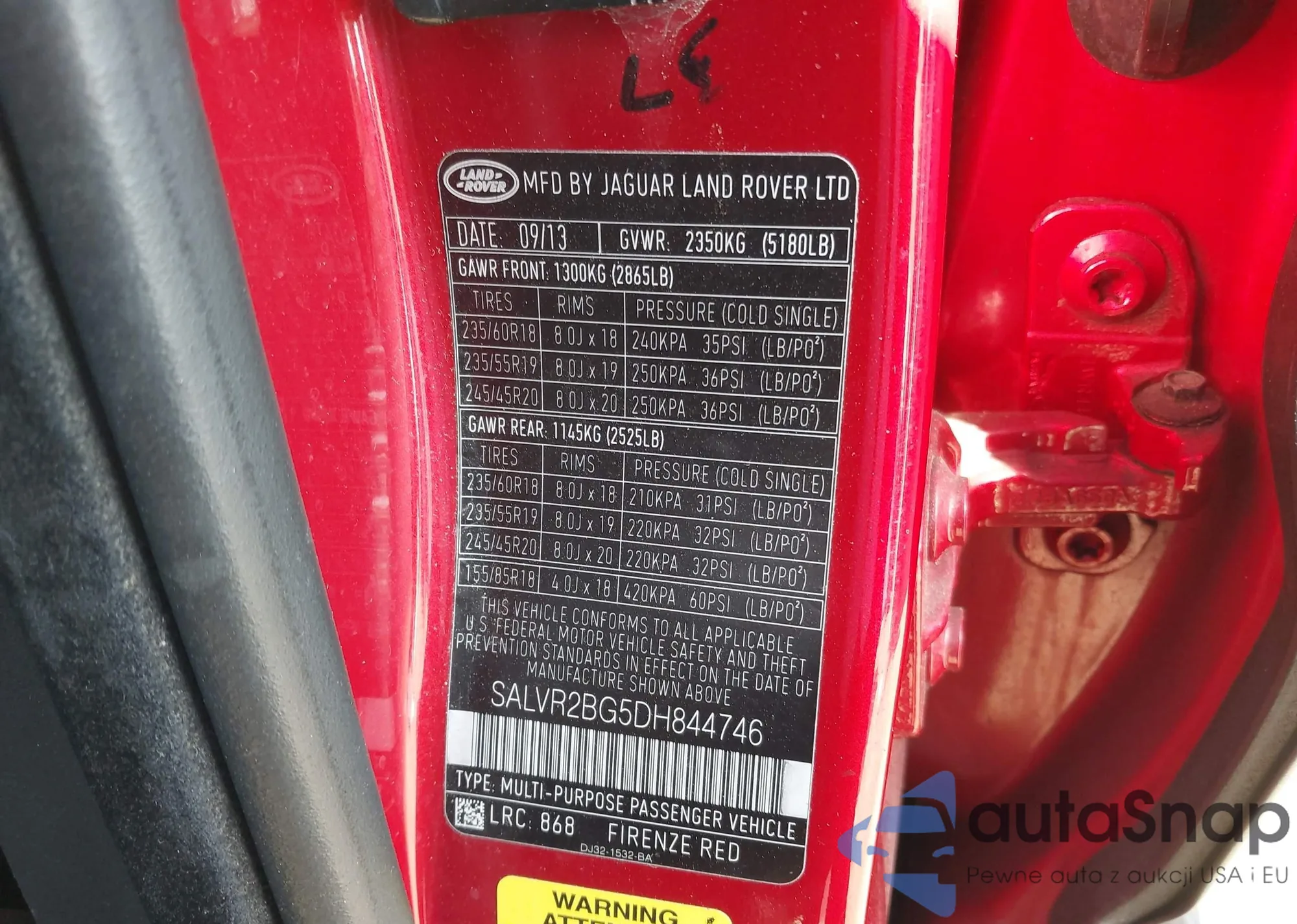 Samochód Land Rover Range Rover Evoque 2013 (VIN SALVR2BG5DH844746) ma dokumenty uniemożliwiające rejestrację. Mogą pojawić się trudności przy eksporcie i rejestracji. Skontaktuj się z ekspertami AutaSnap w celu znalezienia alternatywy.