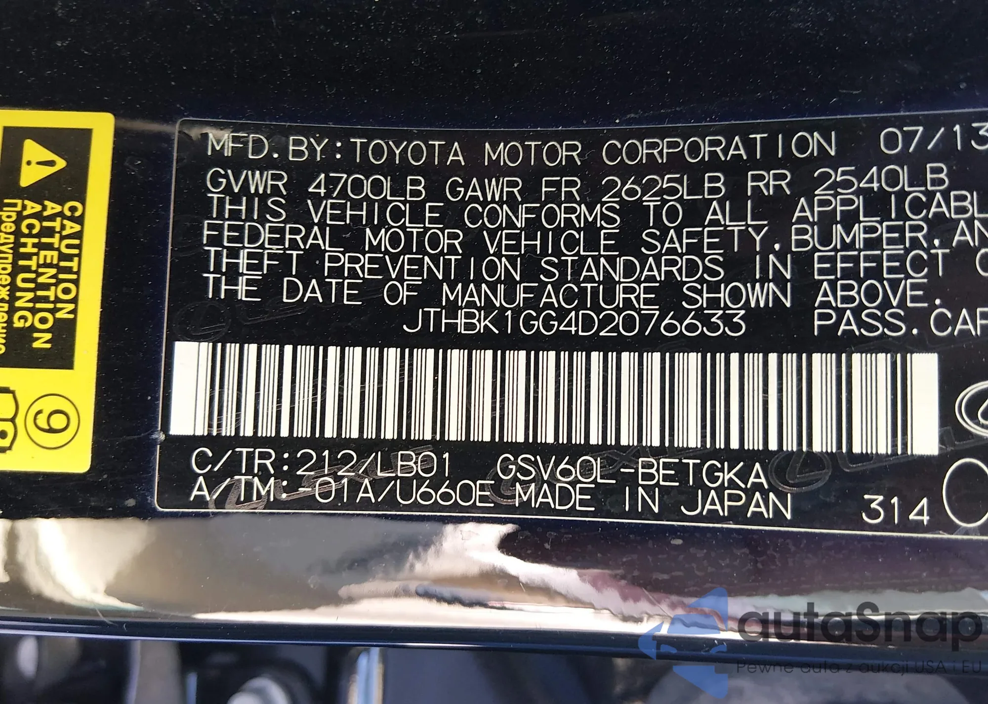 Samochód Lexus ES 2013 (VIN JTHBK1GG4D2076633) nie był wcześniej licytowany. Dokumenty są czyste, przebieg odpowiada lub jest niższy niż średnia rynku. Sprzedaje go firma ubezpieczeniowa – polecamy zakup. Dostawa do portu zajmie ok. 6–8 tygodni.