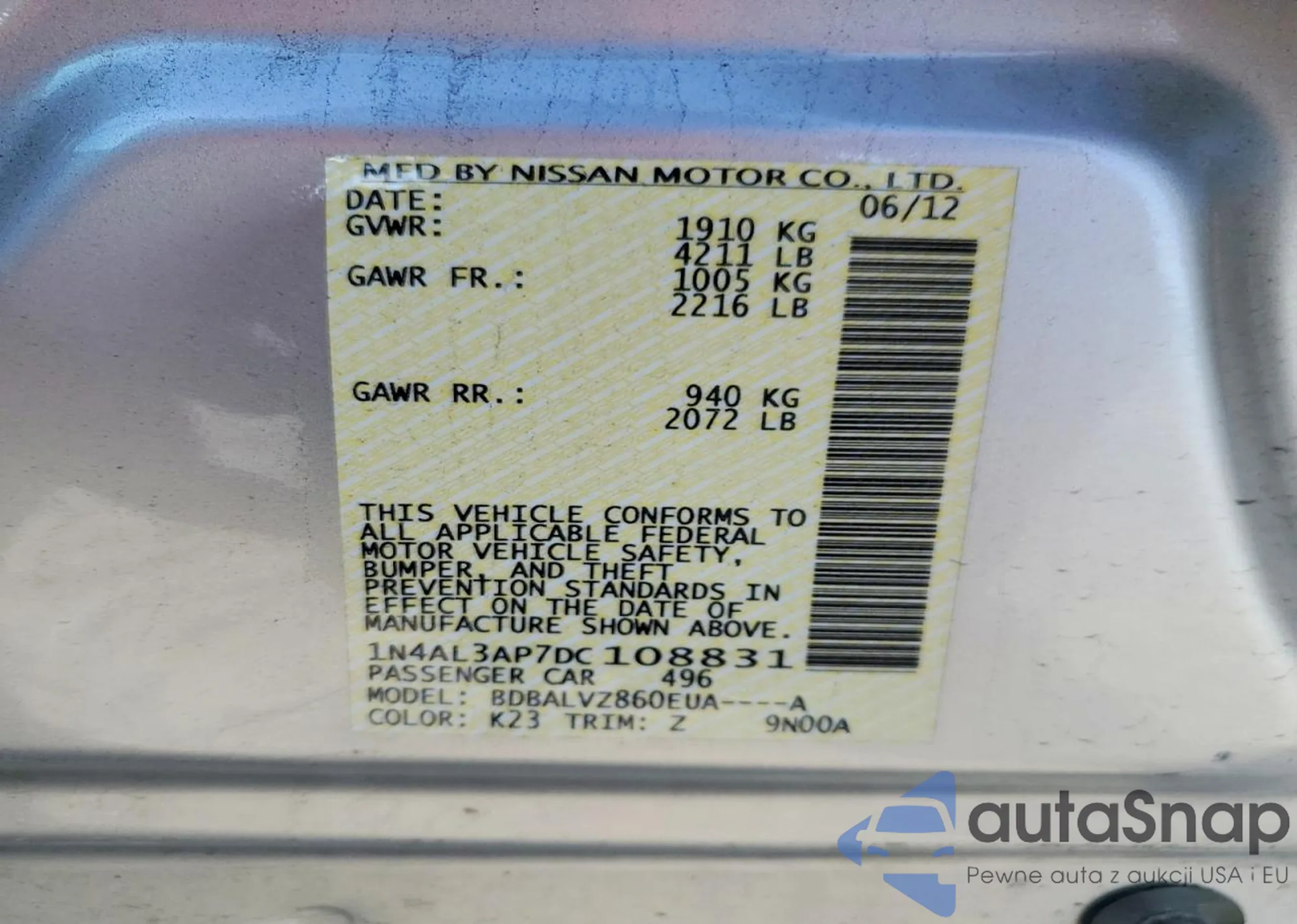 Samochód Nissan Altima 2013 (VIN 1N4AL3AP7DC108831) sprzedaje go niezweryfikowany sprzedawca. Zalecamy raport Carfax i potwierdzenie możliwości rejestracji pojazdu przed zakupem.
