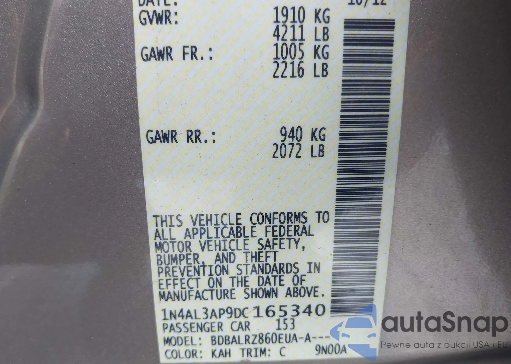 Samochód Nissan Altima 2013 (VIN 1N4AL3AP9DC165340) nie był wcześniej licytowany. Dokumenty są czyste, przebieg odpowiada lub jest niższy niż średnia rynku. Sprzedaje go firma ubezpieczeniowa – polecamy zakup. Dostawa do portu zajmie ok. 6–8 tygodni.