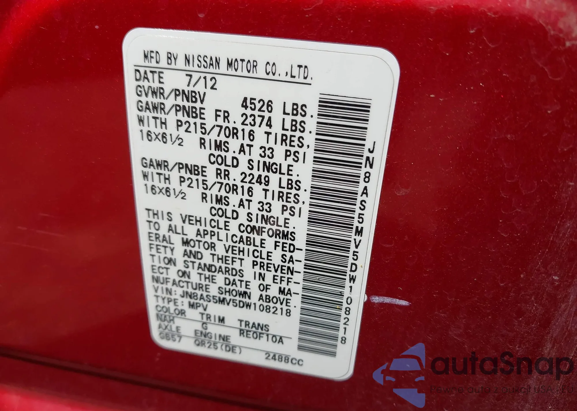 • VIN: JN8AS5MV5DW108218