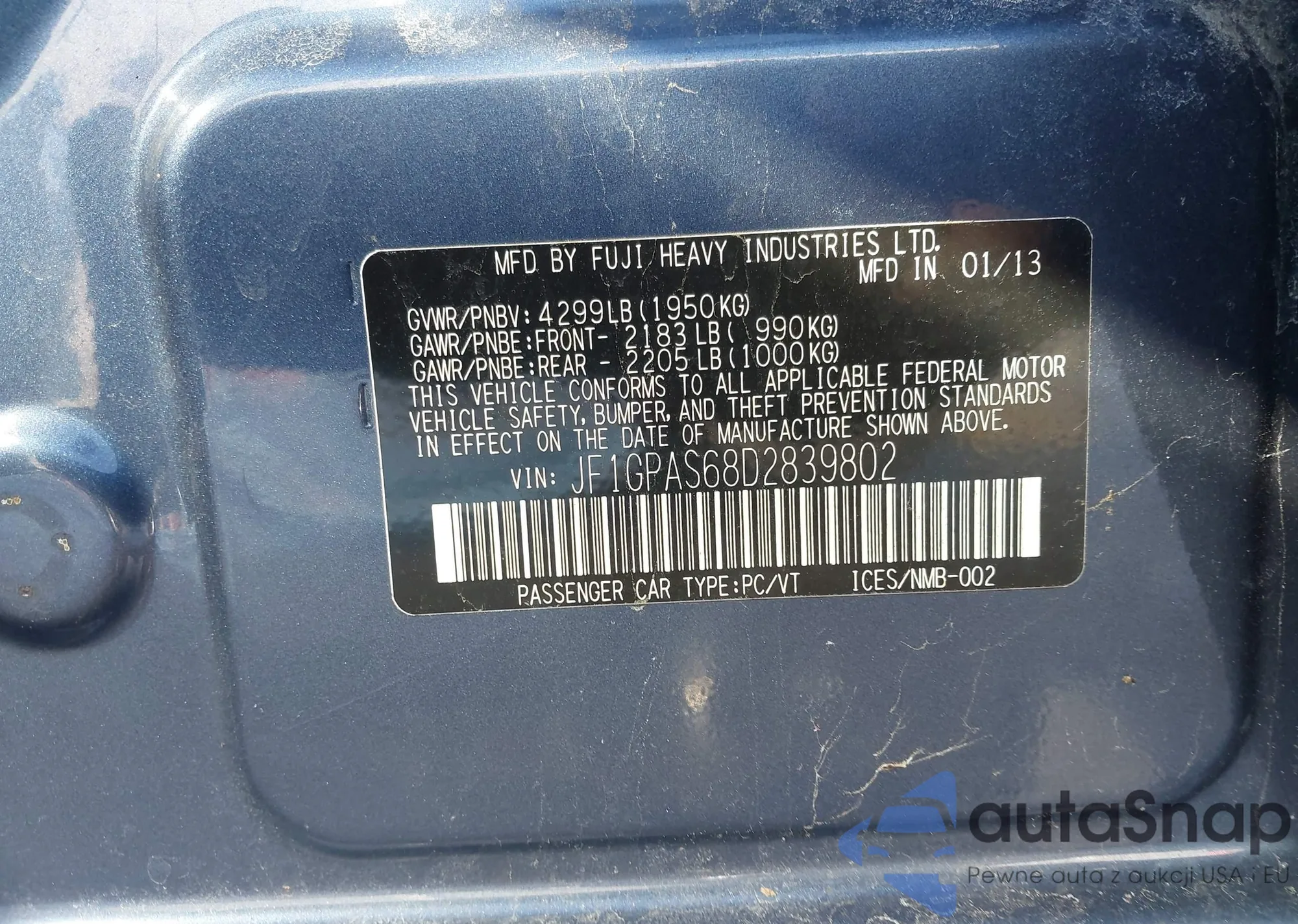 Samochód Subaru Impreza 2013 (VIN JF1GPAS68D2839802) sprzedaje go niezweryfikowany sprzedawca. Zalecamy raport Carfax i potwierdzenie możliwości rejestracji pojazdu przed zakupem.