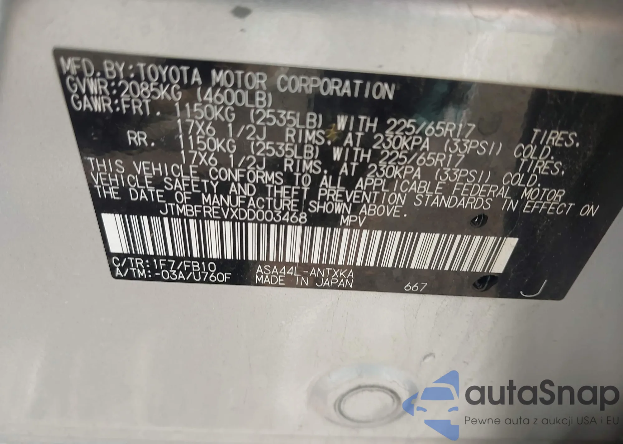 • VIN: JTMBFREVXDD003468
