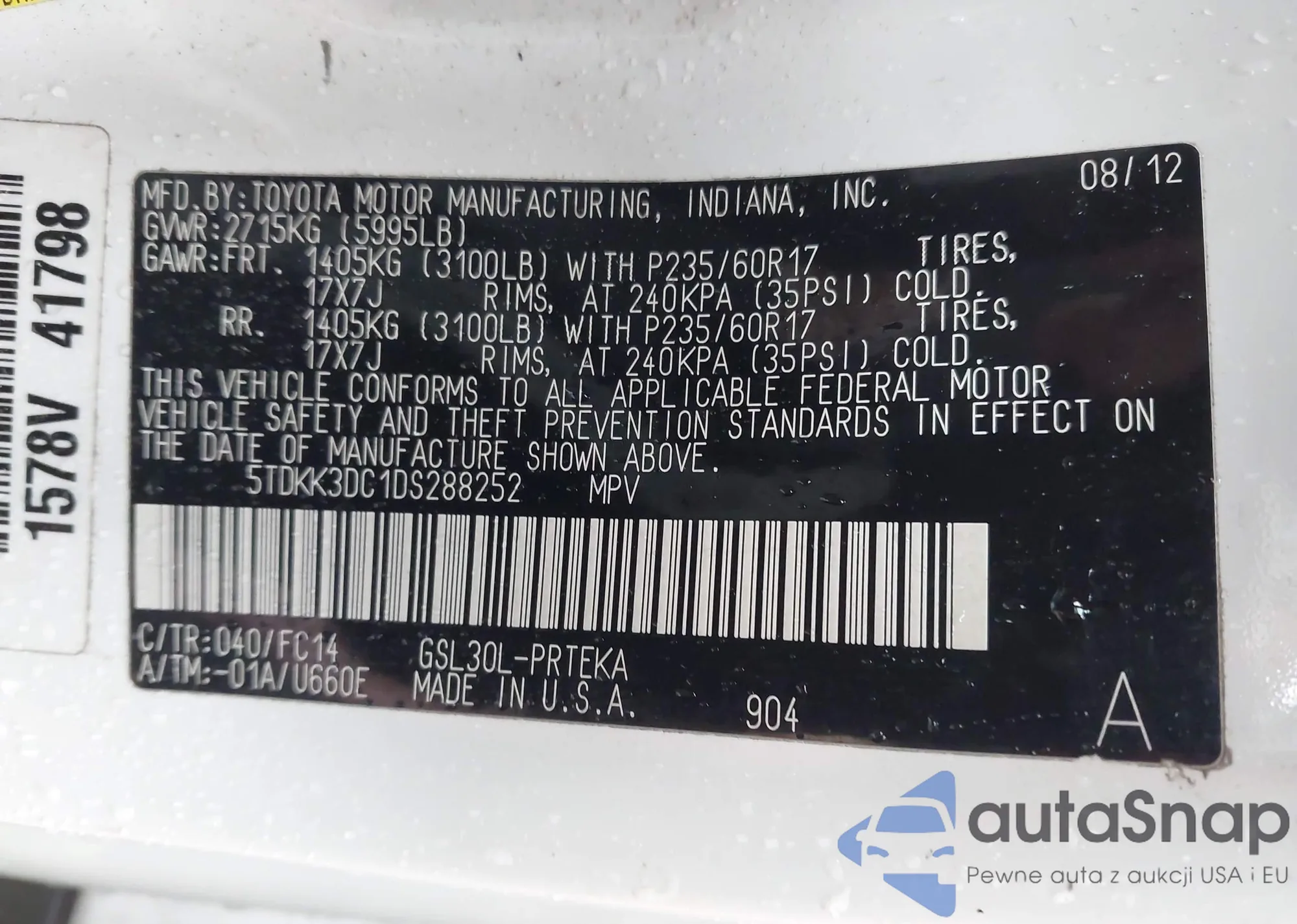 Samochód Toyota Sienna 2013 (VIN 5TDKK3DC1DS288252) nie był wcześniej licytowany. Dokumenty są czyste, przebieg odpowiada lub jest niższy niż średnia rynku. Sprzedaje go firma ubezpieczeniowa – polecamy zakup. Dostawa do portu zajmie ok. 6–8 tygodni.