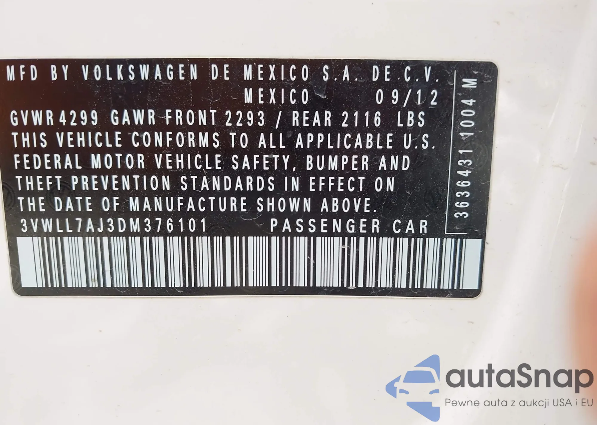 Samochód Volkswagen Jetta 2013 (VIN 3VWLL7AJ3DM376101) nie był wcześniej licytowany. Dokumenty są czyste, przebieg odpowiada lub jest niższy niż średnia rynku. Sprzedaje go firma ubezpieczeniowa – polecamy zakup. Dostawa do portu zajmie ok. 6–8 tygodni.