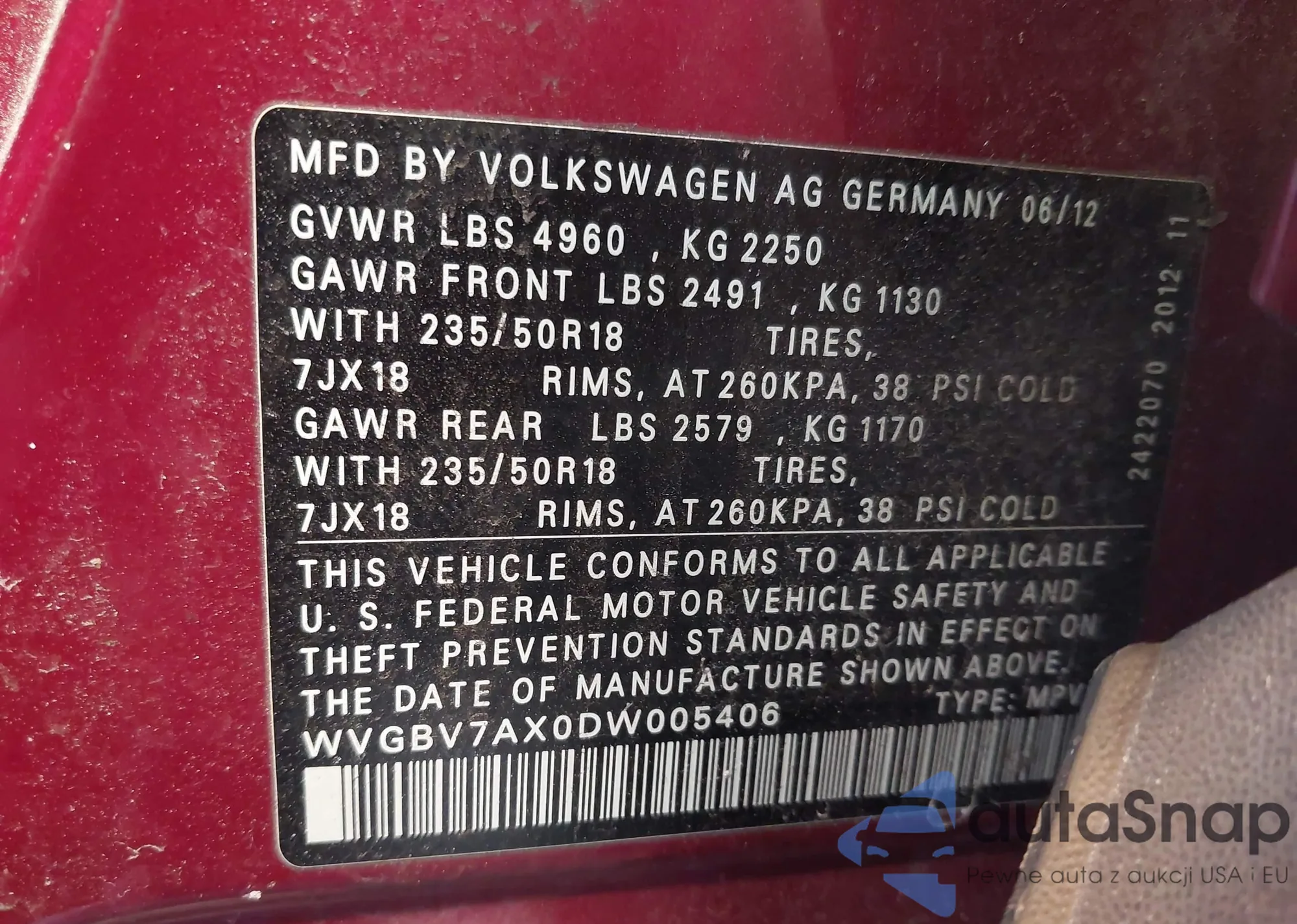 Samochód Volkswagen Tiguan 2013 (VIN WVGBV7AX0DW005406) nie był wcześniej licytowany. Dokumenty są czyste, przebieg odpowiada lub jest niższy niż średnia rynku. Sprzedaje go firma ubezpieczeniowa – polecamy zakup. Dostawa do portu zajmie ok. 6–8 tygodni.