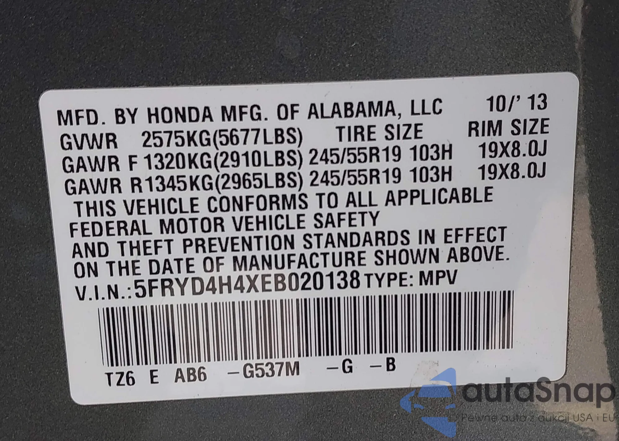 • VIN: 5FRYD4H4XEB020138