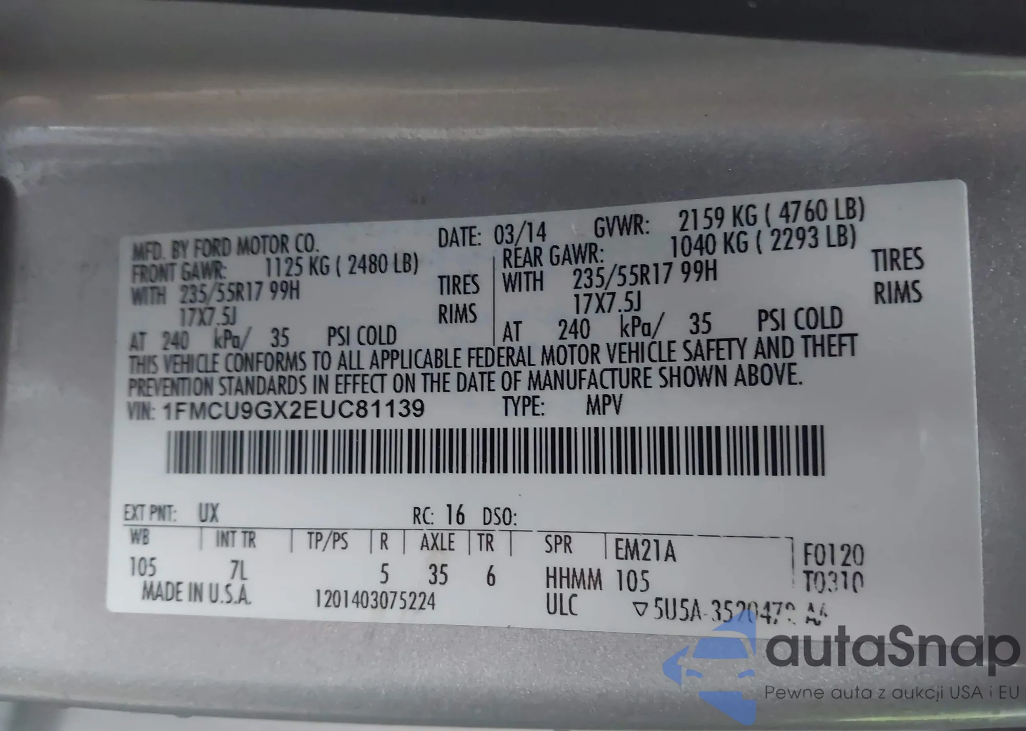Samochód Ford Escape 2014 (VIN 1FMCU9GX2EUC81139) nie był wcześniej licytowany. Dokumenty są czyste, przebieg odpowiada lub jest niższy niż średnia rynku. Sprzedaje go firma ubezpieczeniowa – polecamy zakup. Dostawa do portu zajmie ok. 6–8 tygodni.