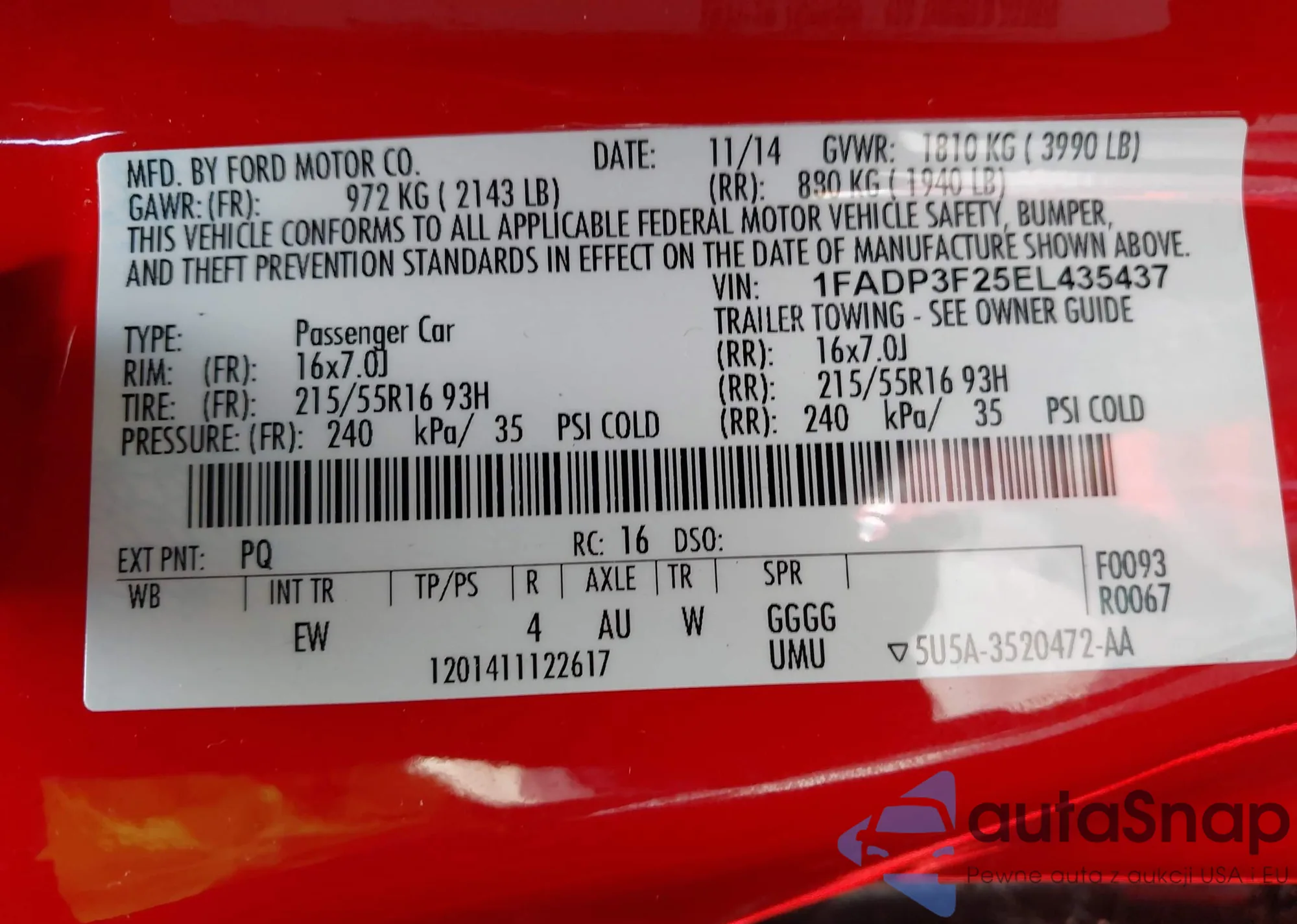 VIN: 1FADP3F25EL435437