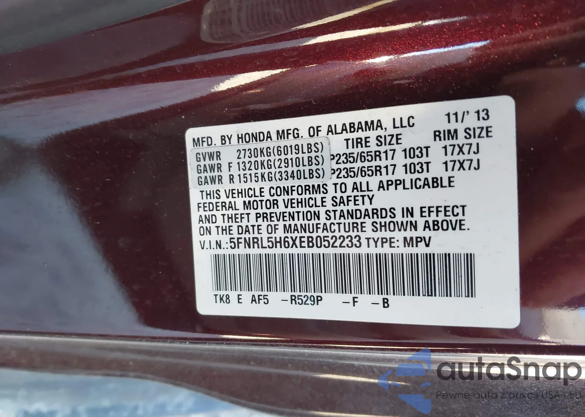 Samochód Honda Odyssey 2014 (VIN 5FNRL5H6XEB052233) nie był wcześniej licytowany. Dokumenty są czyste, przebieg odpowiada lub jest niższy niż średnia rynku. Sprzedaje go firma ubezpieczeniowa – polecamy zakup. Dostawa do portu zajmie ok. 6–8 tygodni.