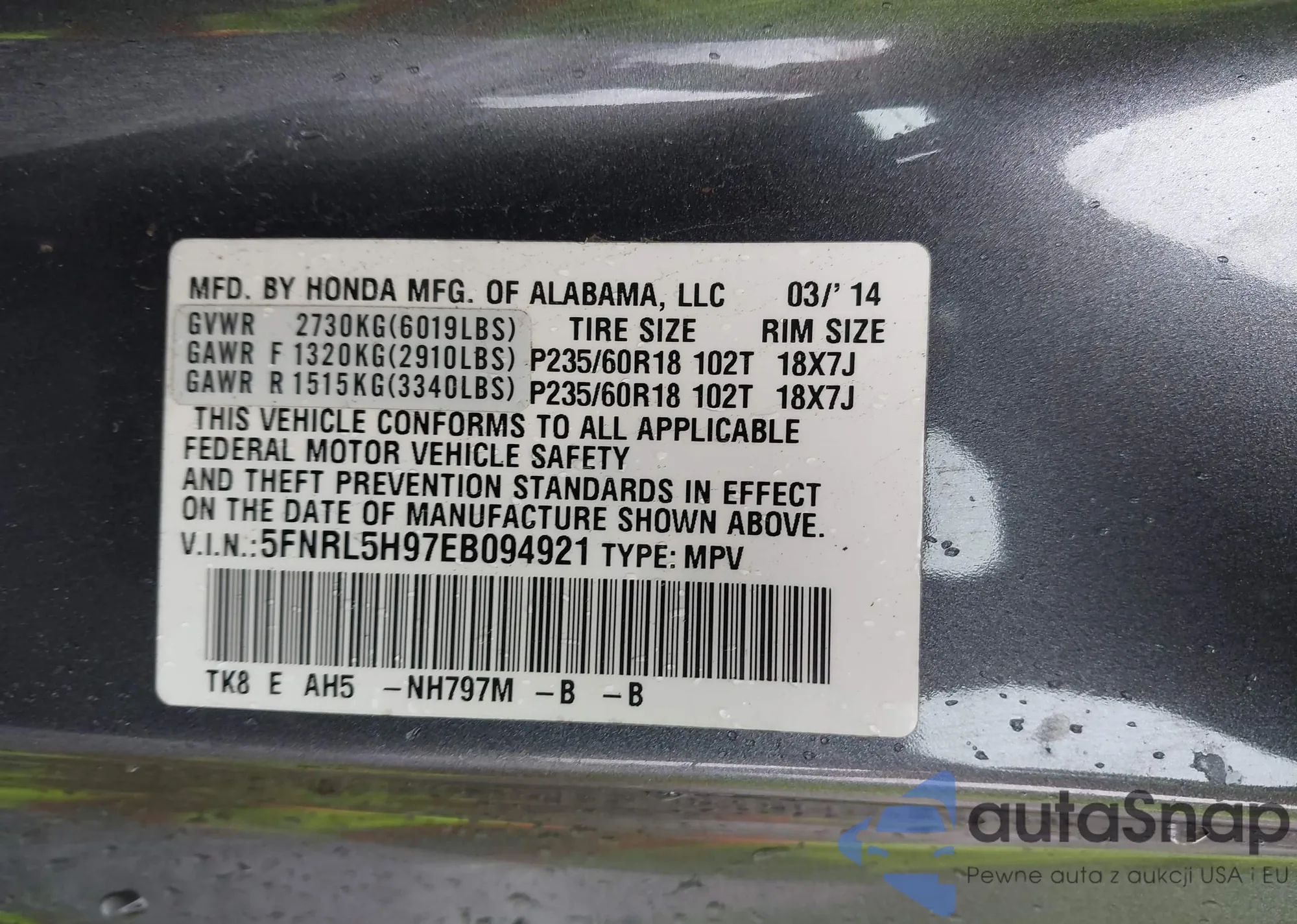 Samochód Honda Odyssey 2014 (VIN 5FNRL5H97EB094921) nie był wcześniej licytowany. Dokumenty są czyste, przebieg odpowiada lub jest niższy niż średnia rynku. Sprzedaje go firma ubezpieczeniowa – polecamy zakup. Dostawa do portu zajmie ok. 6–8 tygodni.