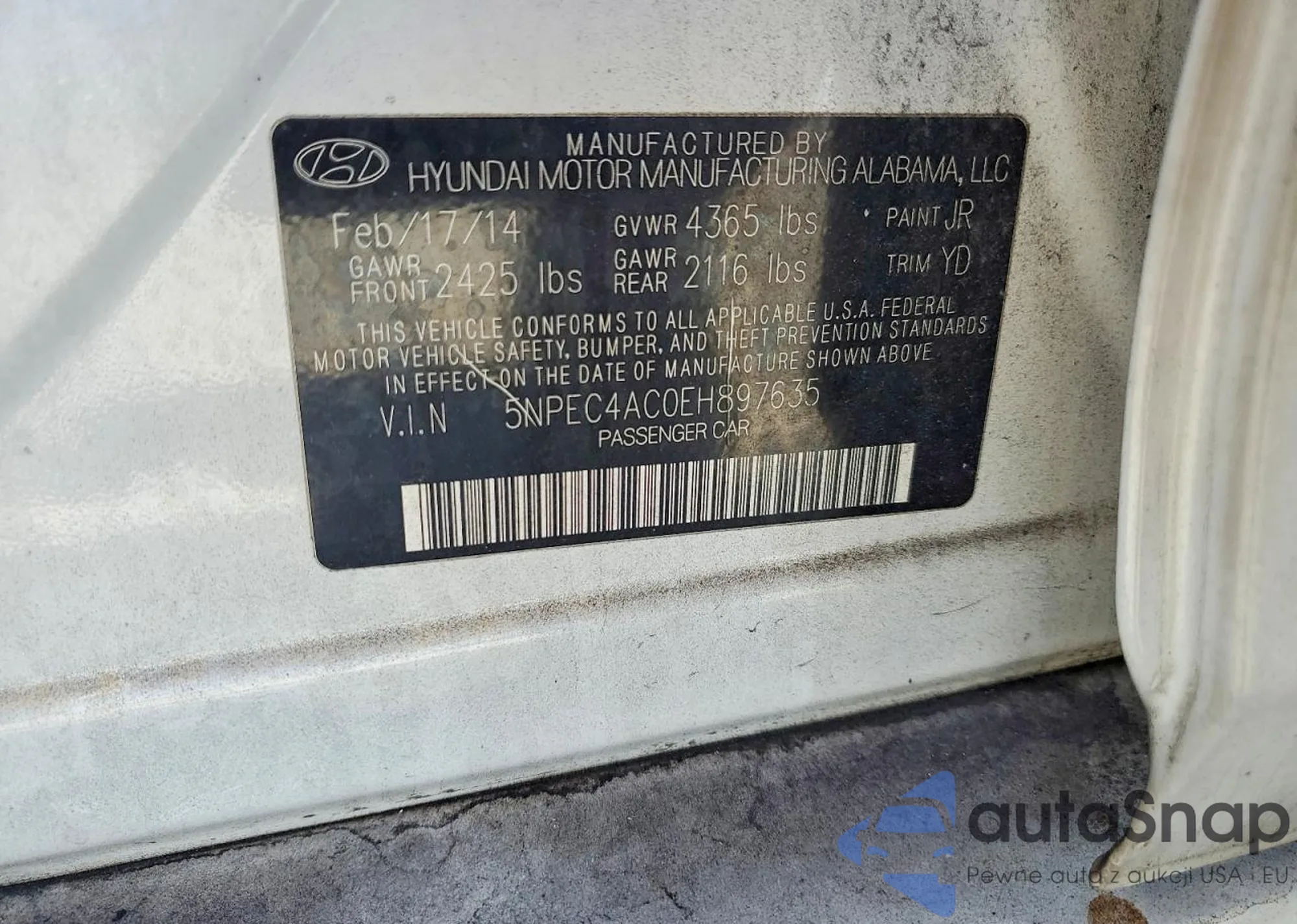 Samochód Hyundai Sonata 2014 (VIN 5NPEC4AC0EH897635) ma dokumenty uniemożliwiające rejestrację. Mogą pojawić się trudności przy eksporcie i rejestracji. Skontaktuj się z ekspertami AutaSnap w celu znalezienia alternatywy.