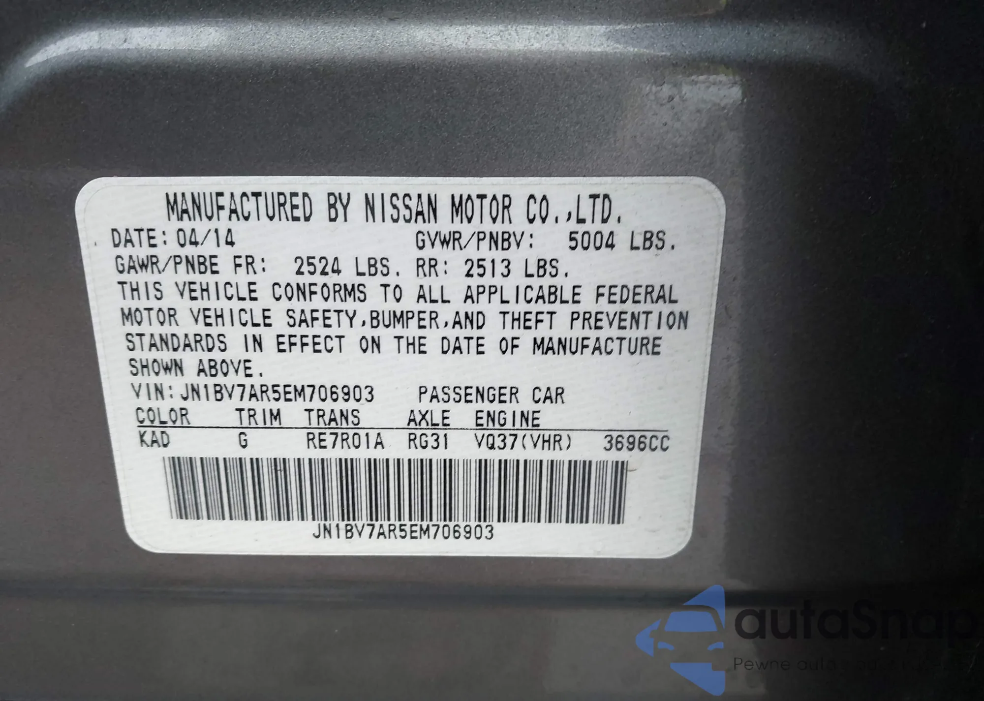 Samochód Infiniti Q50 2014 (VIN JN1BV7AR5EM706903) nie był wcześniej licytowany. Dokumenty są czyste, przebieg odpowiada lub jest niższy niż średnia rynku. Sprzedaje go firma ubezpieczeniowa – polecamy zakup. Dostawa do portu zajmie ok. 6–8 tygodni.