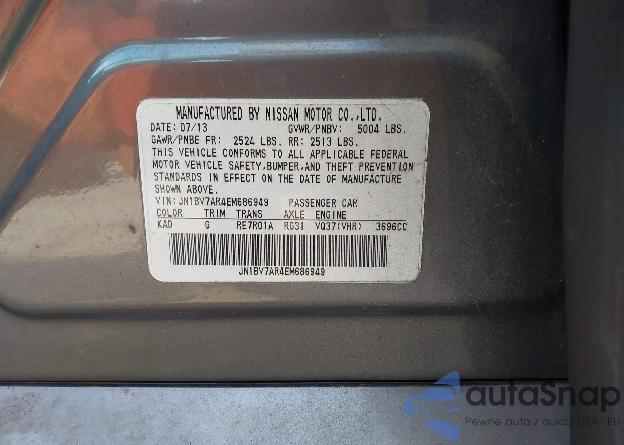 Samochód Infiniti Q50 2014 (VIN JN1BV7AR4EM686949) nie był wcześniej licytowany. Dokumenty są czyste, przebieg odpowiada lub jest niższy niż średnia rynku. Sprzedaje go firma ubezpieczeniowa – polecamy zakup. Dostawa do portu zajmie ok. 6–8 tygodni.