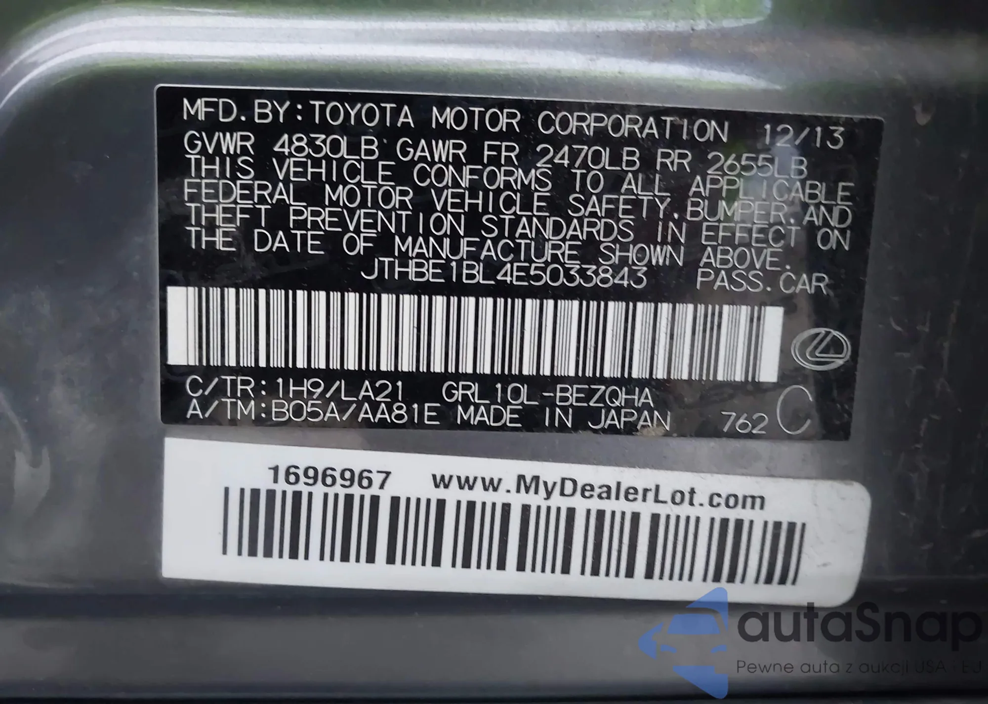 Samochód Lexus GS 2014 (VIN JTHBE1BL4E5033843) nie był wcześniej licytowany. Dokumenty są czyste, przebieg odpowiada lub jest niższy niż średnia rynku. Sprzedaje go firma ubezpieczeniowa – polecamy zakup. Dostawa do portu zajmie ok. 6–8 tygodni.