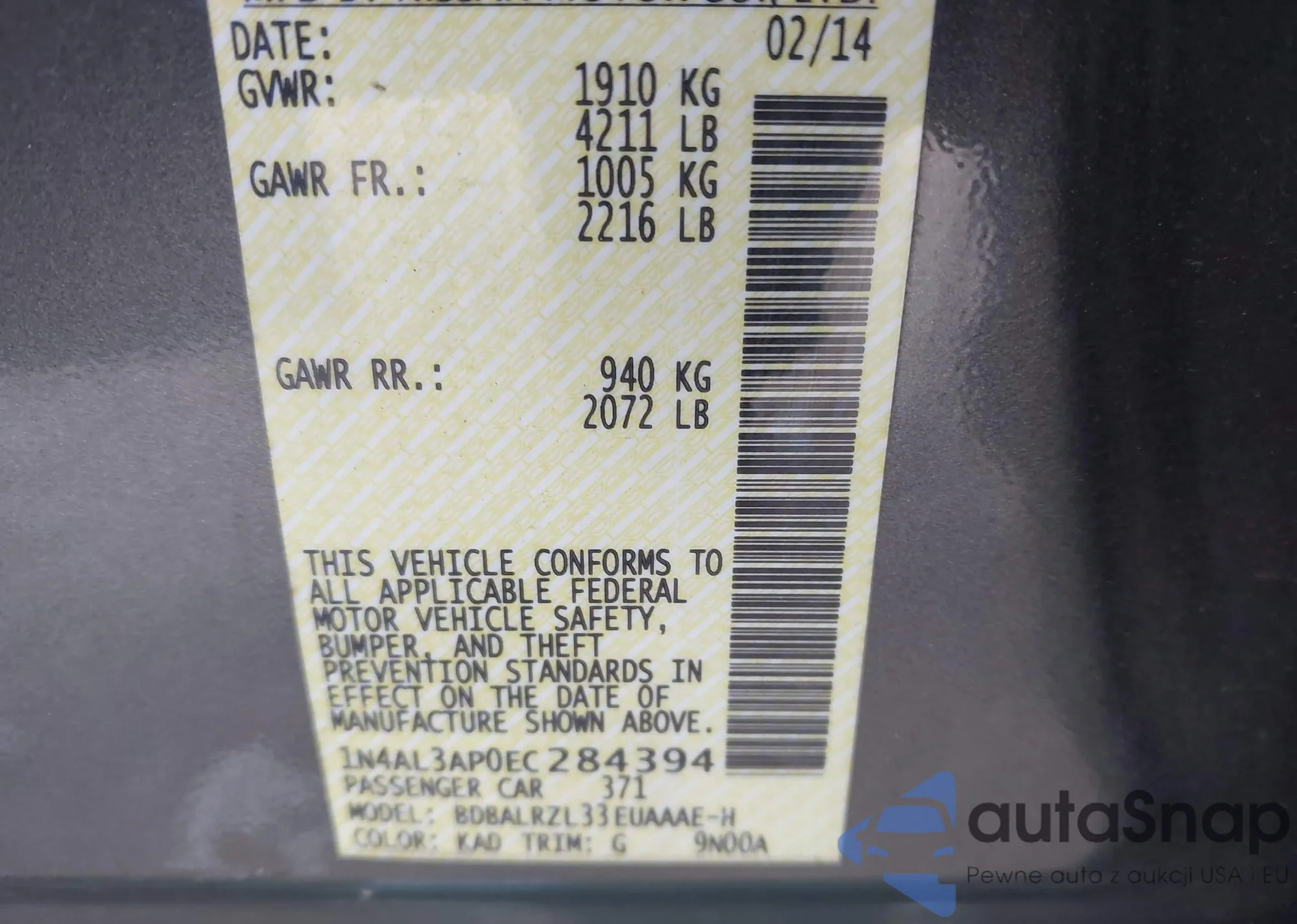 VIN: 1N4AL3AP0EC284394