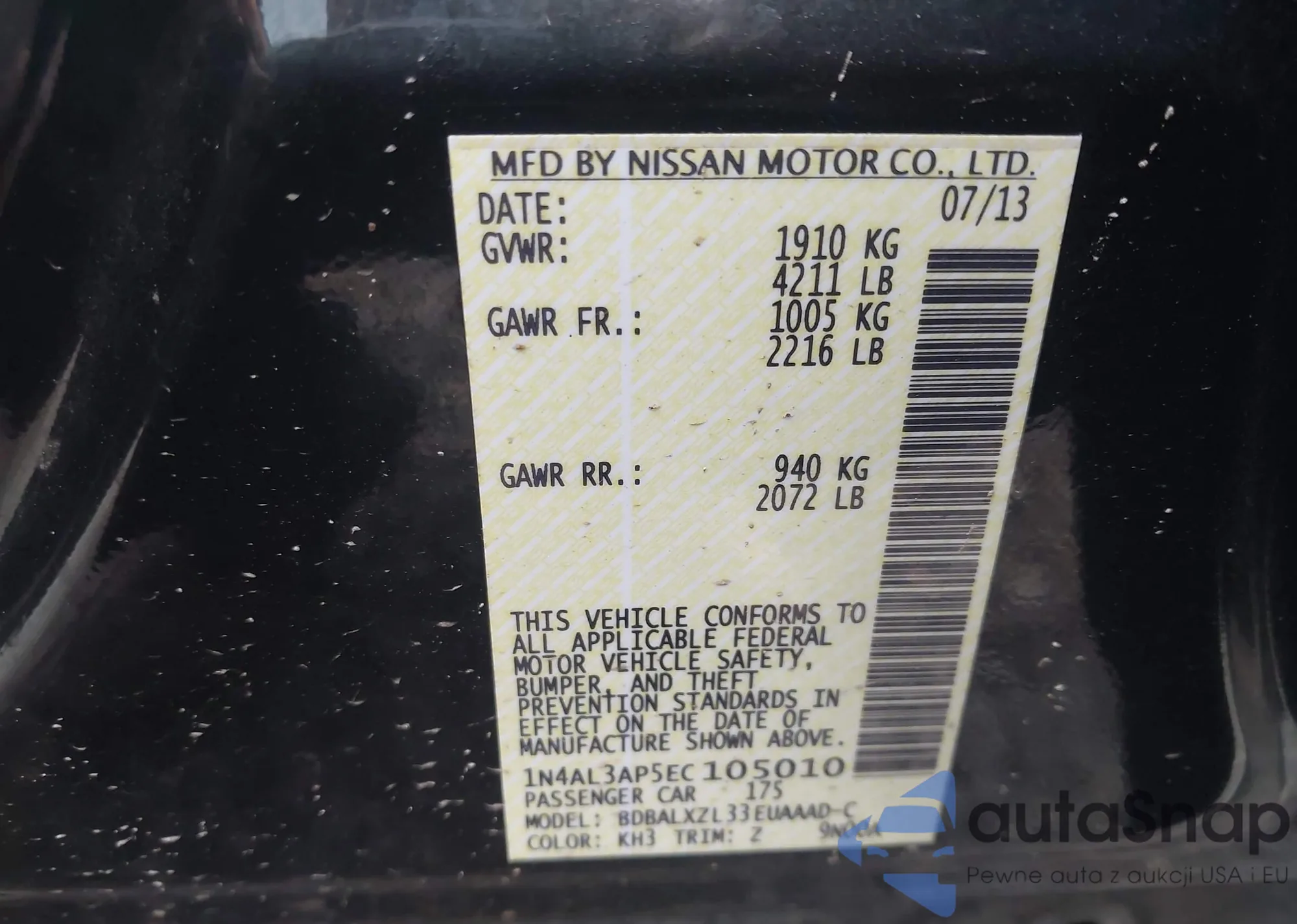 Samochód Nissan Altima 2014 (VIN 1N4AL3AP5EC105010) nie był wcześniej licytowany. Dokumenty są czyste, przebieg odpowiada lub jest niższy niż średnia rynku. Sprzedaje go firma ubezpieczeniowa – polecamy zakup. Dostawa do portu zajmie ok. 6–8 tygodni.