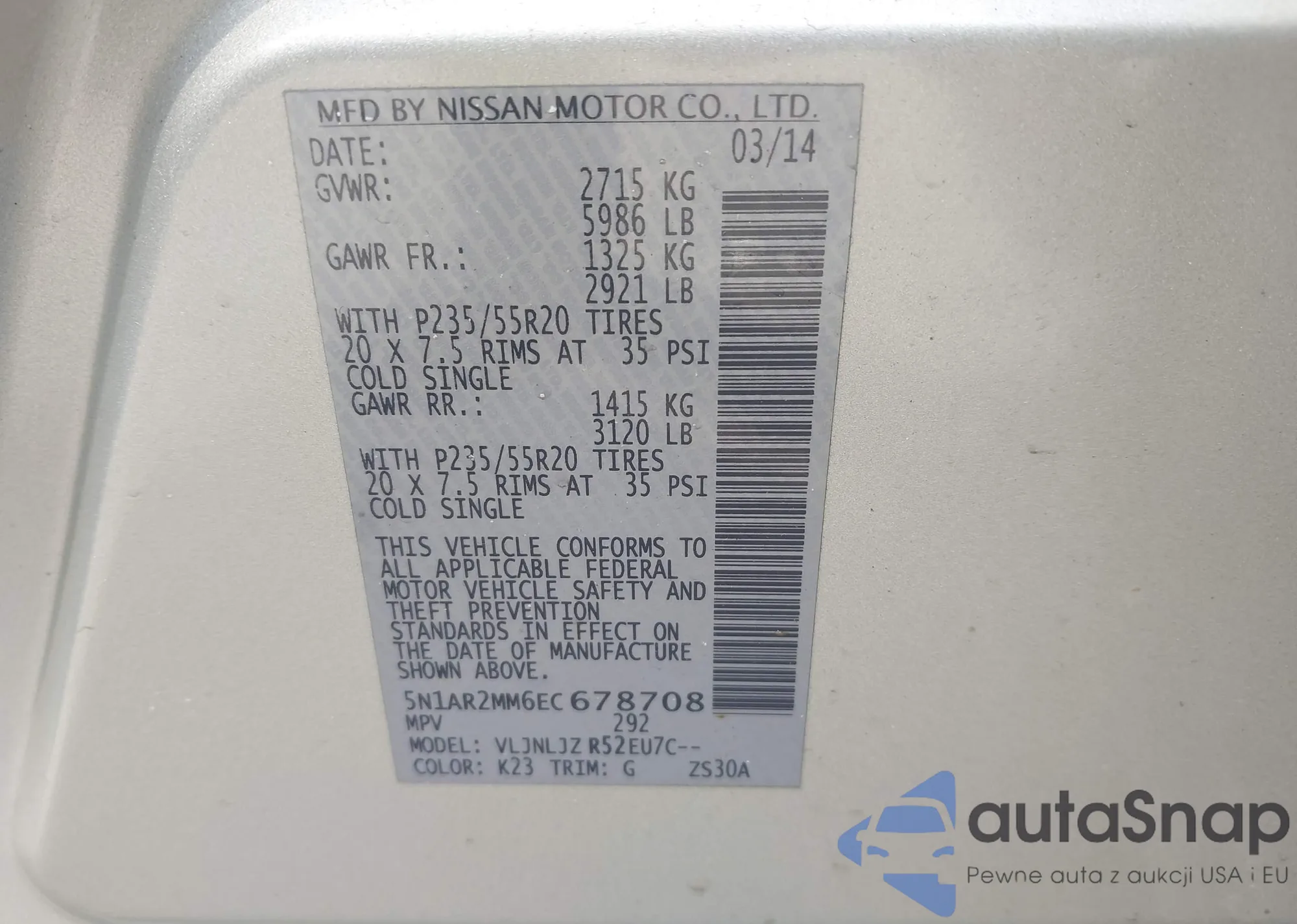 Samochód Nissan Pathfinder 2014 (VIN 5N1AR2MM6EC678708) sprzedaje go niezweryfikowany sprzedawca. Zalecamy raport Carfax i potwierdzenie możliwości rejestracji pojazdu przed zakupem.