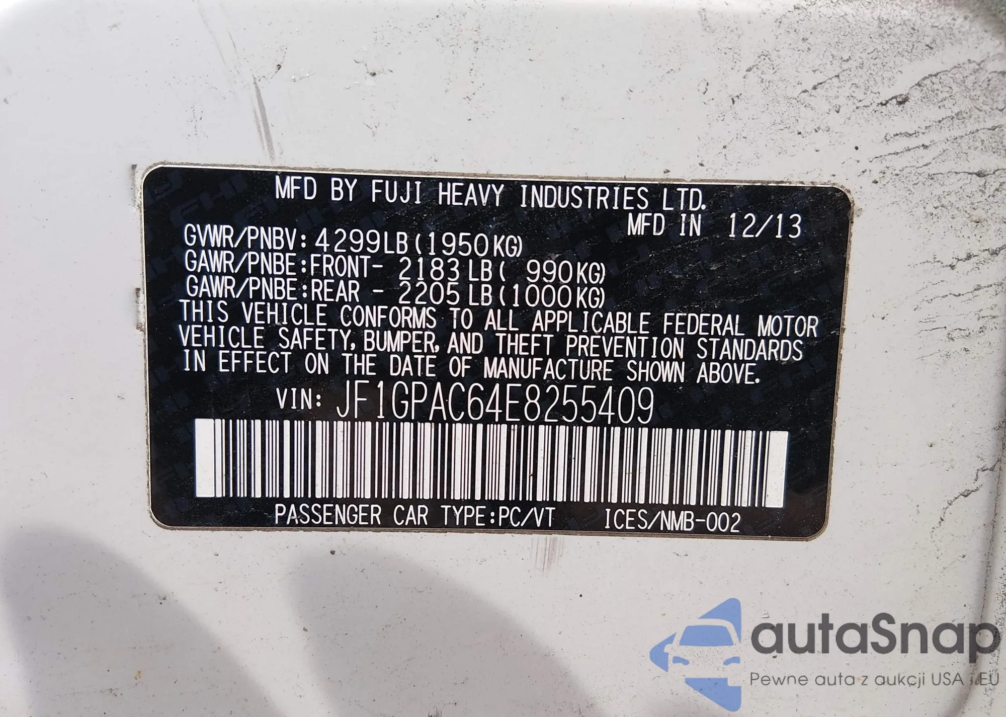 Samochód Subaru Impreza 2014 (VIN JF1GPAC64E8255409) nie był wcześniej licytowany. Dokumenty są czyste, przebieg odpowiada lub jest niższy niż średnia rynku. Sprzedaje go firma ubezpieczeniowa – polecamy zakup. Dostawa do portu zajmie ok. 6–8 tygodni.