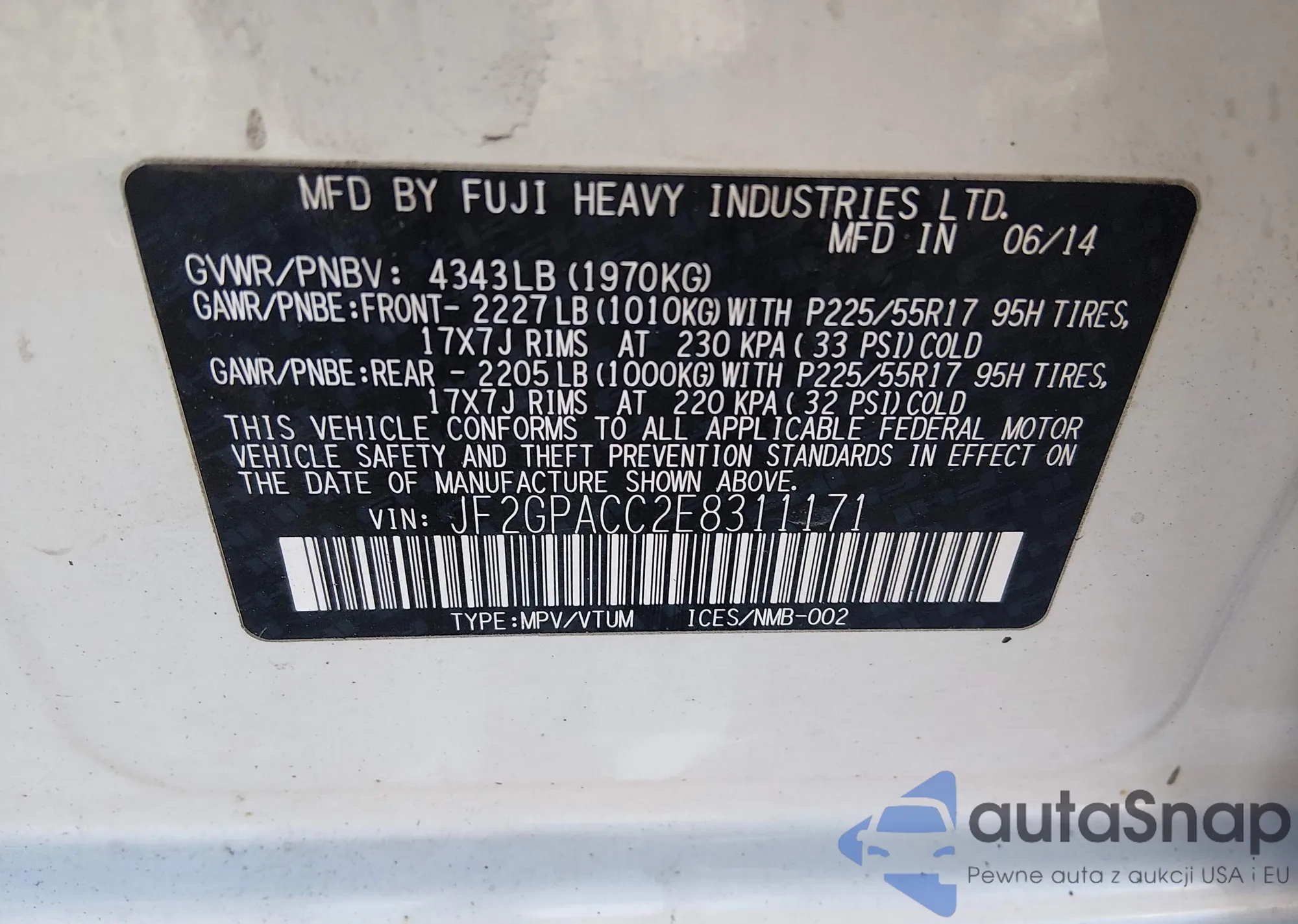 • VIN: JF2GPACC2E8311171