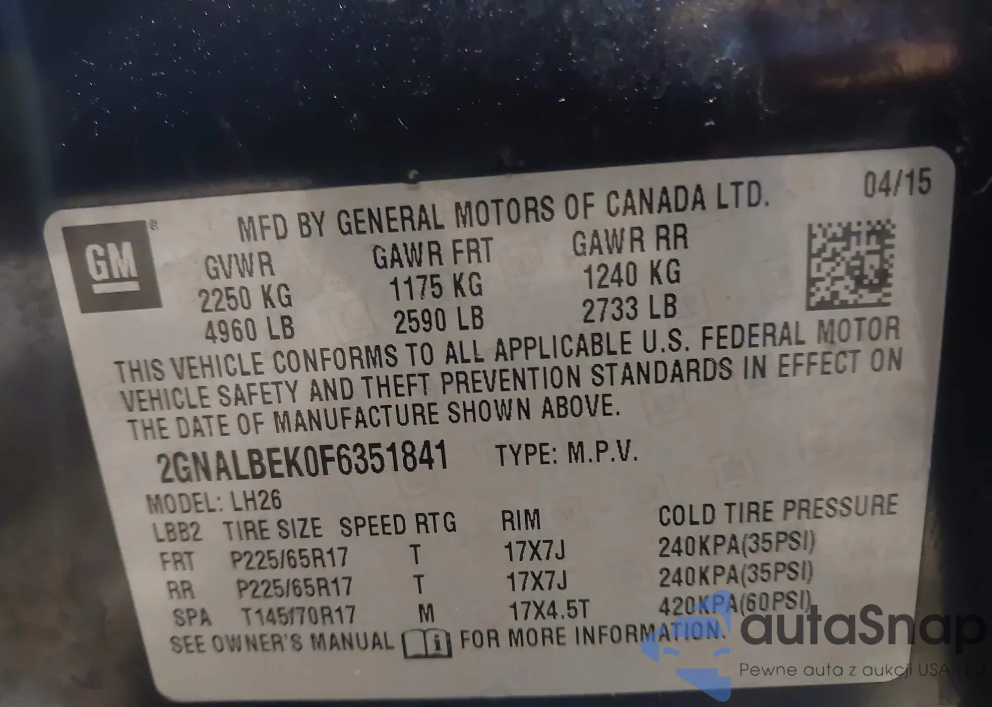 Samochód Chevrolet Equinox 2015 (VIN 2GNALBEK0F6351841) nie był wcześniej licytowany. Dokumenty są czyste, przebieg odpowiada lub jest niższy niż średnia rynku. Sprzedaje go firma ubezpieczeniowa – polecamy zakup. Dostawa do portu zajmie ok. 6–8 tygodni.