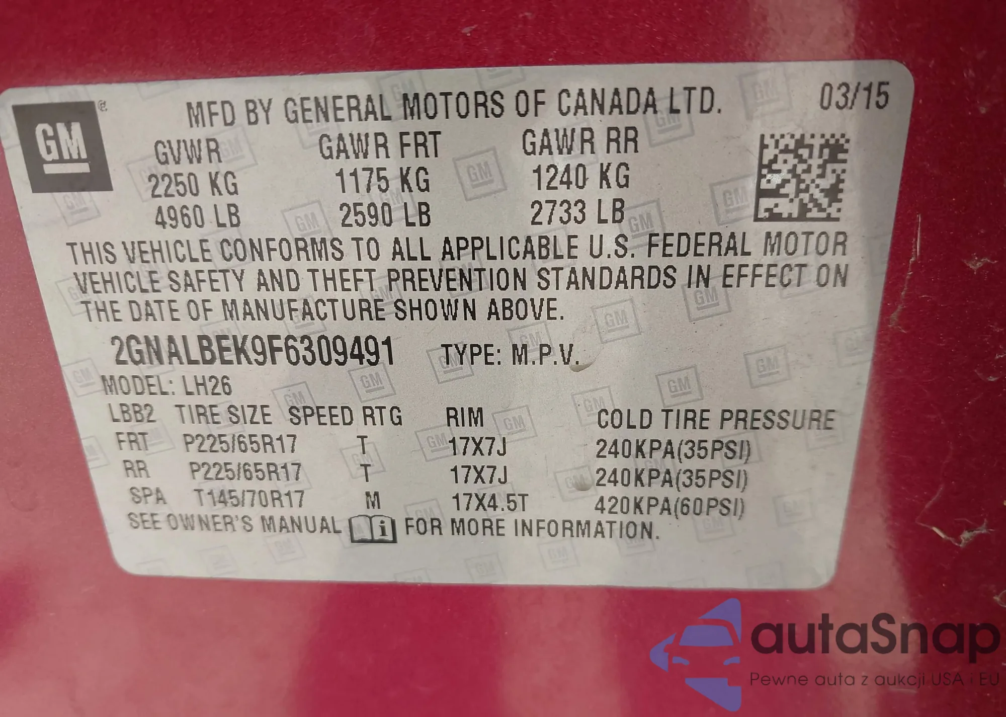 Samochód Chevrolet Equinox 2015 (VIN 2GNALBEK9F6309491) nie był wcześniej licytowany. Dokumenty są czyste, przebieg odpowiada lub jest niższy niż średnia rynku. Sprzedaje go firma ubezpieczeniowa – polecamy zakup. Dostawa do portu zajmie ok. 6–8 tygodni.