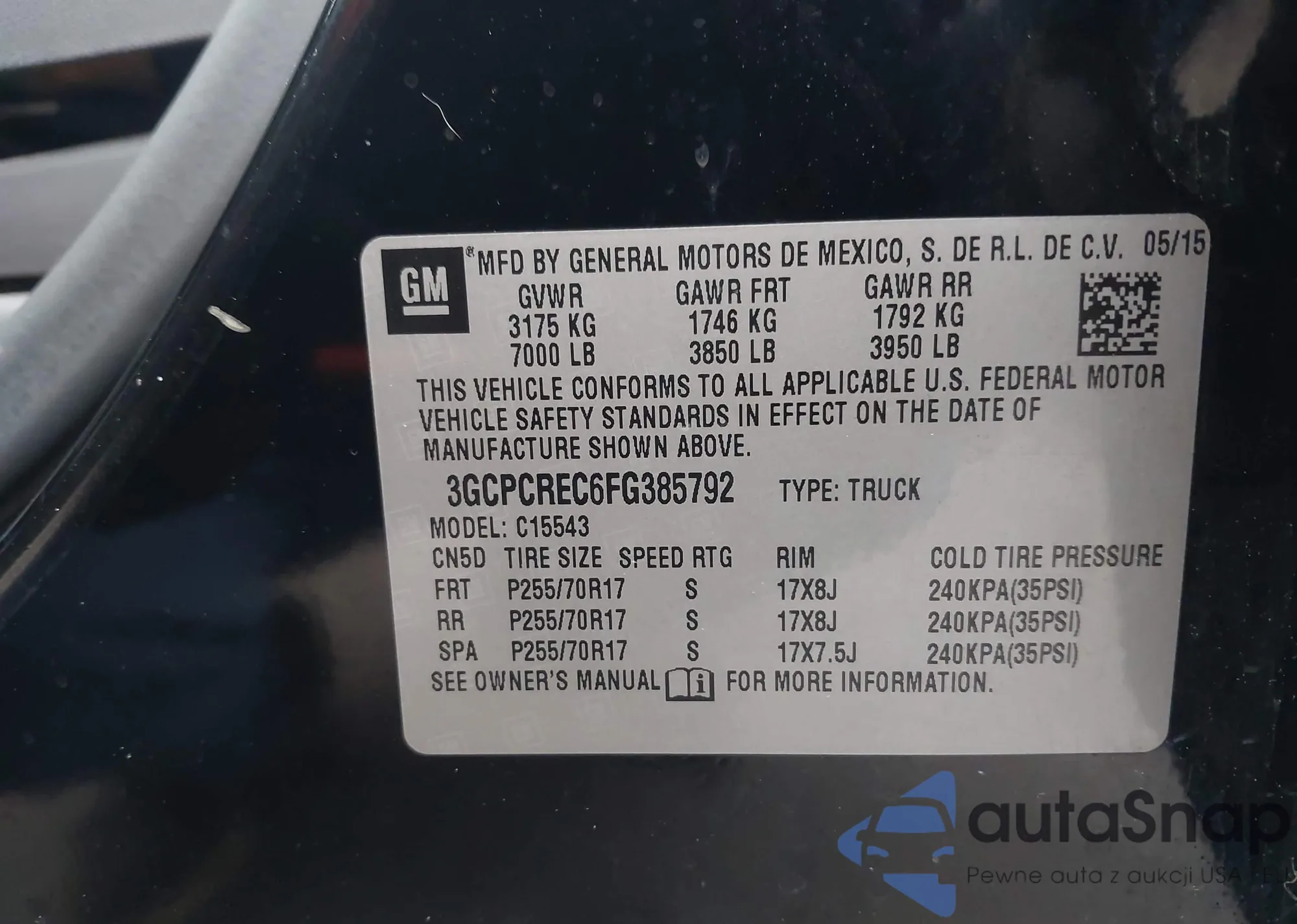 Samochód Chevrolet Silverado 2015 (VIN 3GCPCREC6FG385792) nie był wcześniej licytowany. Dokumenty są czyste, przebieg odpowiada lub jest niższy niż średnia rynku. Sprzedaje go firma ubezpieczeniowa – polecamy zakup. Dostawa do portu zajmie ok. 6–8 tygodni.