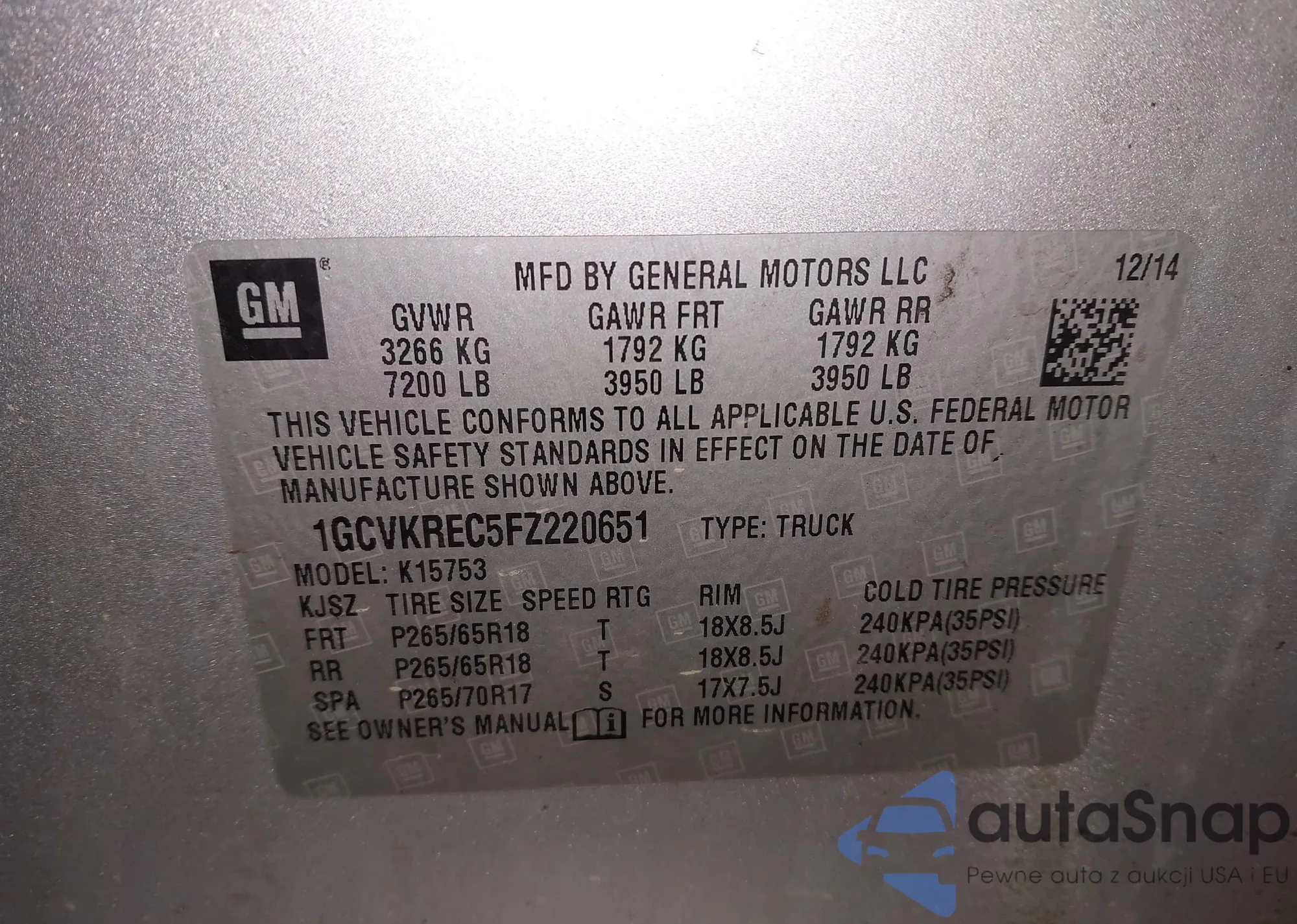 Samochód Chevrolet Silverado 2015 (VIN 1GCVKREC5FZ220651) nie był wcześniej licytowany. Dokumenty są czyste, przebieg odpowiada lub jest niższy niż średnia rynku. Sprzedaje go firma ubezpieczeniowa – polecamy zakup. Dostawa do portu zajmie ok. 6–8 tygodni.