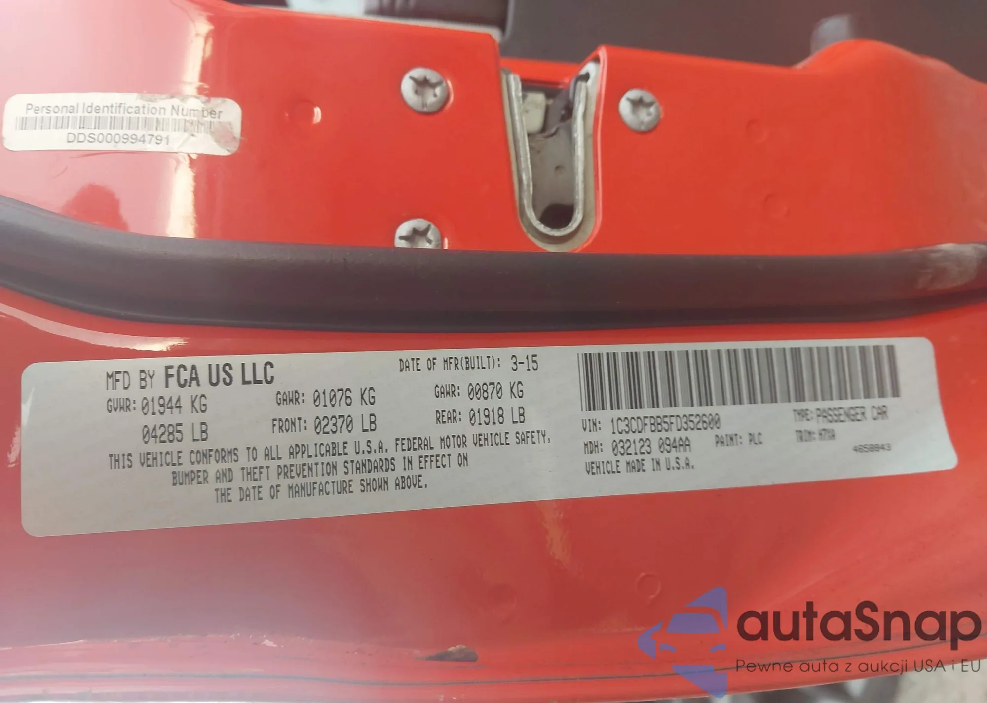 Samochód Dodge Dart 2015 (VIN 1C3CDFBB5FD352600) nie był wcześniej licytowany. Dokumenty są czyste, przebieg odpowiada lub jest niższy niż średnia rynku. Sprzedaje go firma ubezpieczeniowa – polecamy zakup. Dostawa do portu zajmie ok. 6–8 tygodni.