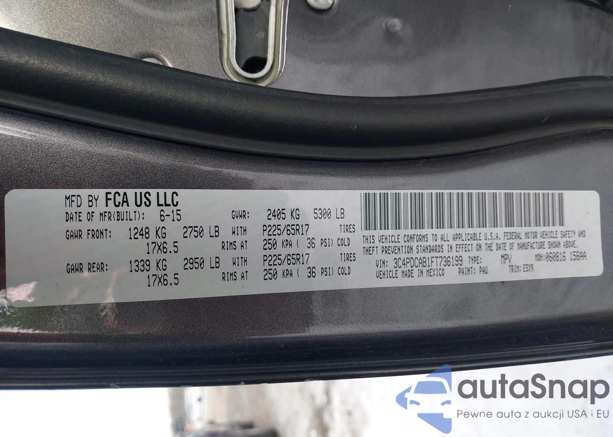 Samochód Dodge Journey 2015 (VIN 3C4PDCAB1FT736199) nie był wcześniej licytowany. Dokumenty są czyste, przebieg odpowiada lub jest niższy niż średnia rynku. Sprzedaje go firma ubezpieczeniowa – polecamy zakup. Dostawa do portu zajmie ok. 6–8 tygodni.