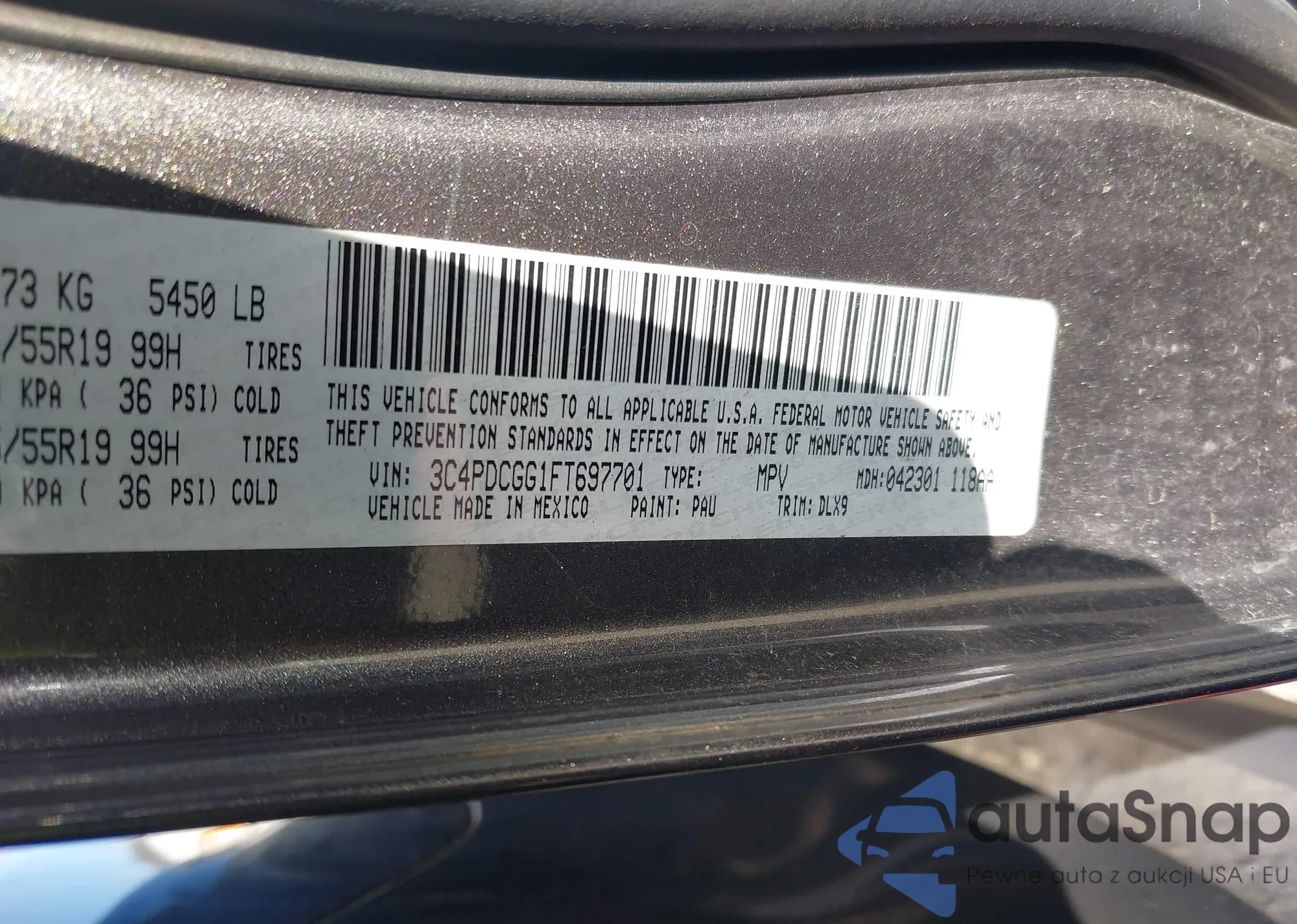 Samochód Dodge Journey 2015 (VIN 3C4PDCGG1FT697701) nie był wcześniej licytowany. Dokumenty są czyste, przebieg odpowiada lub jest niższy niż średnia rynku. Sprzedaje go firma ubezpieczeniowa – polecamy zakup. Dostawa do portu zajmie ok. 6–8 tygodni.