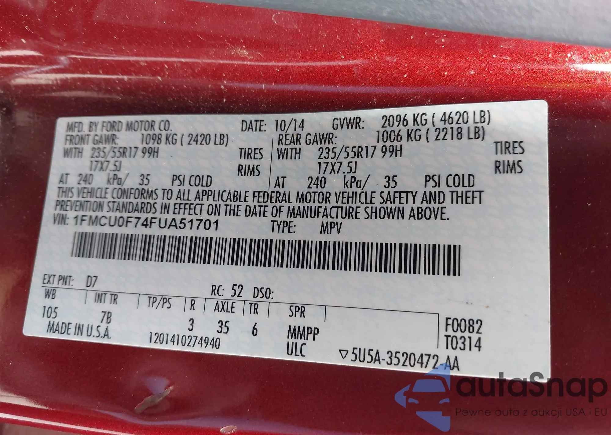 Samochód Ford Escape 2015 (VIN 1FMCU0F74FUA51701) nie był wcześniej licytowany. Dokumenty są czyste, przebieg odpowiada lub jest niższy niż średnia rynku. Sprzedaje go firma ubezpieczeniowa – polecamy zakup. Dostawa do portu zajmie ok. 6–8 tygodni.