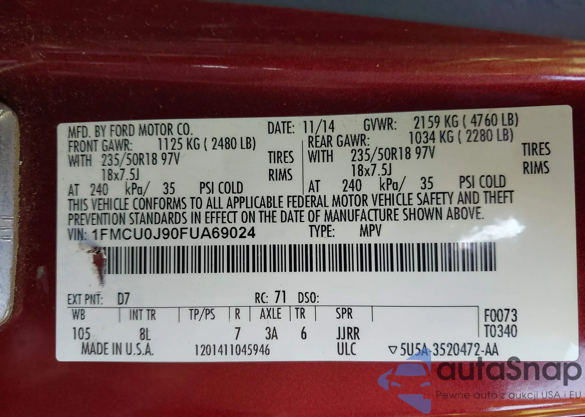 Samochód Ford Escape 2015 (VIN 1FMCU0J90FUA69024) nie był wcześniej licytowany. Dokumenty są czyste, przebieg odpowiada lub jest niższy niż średnia rynku. Sprzedaje go firma ubezpieczeniowa – polecamy zakup. Dostawa do portu zajmie ok. 6–8 tygodni.