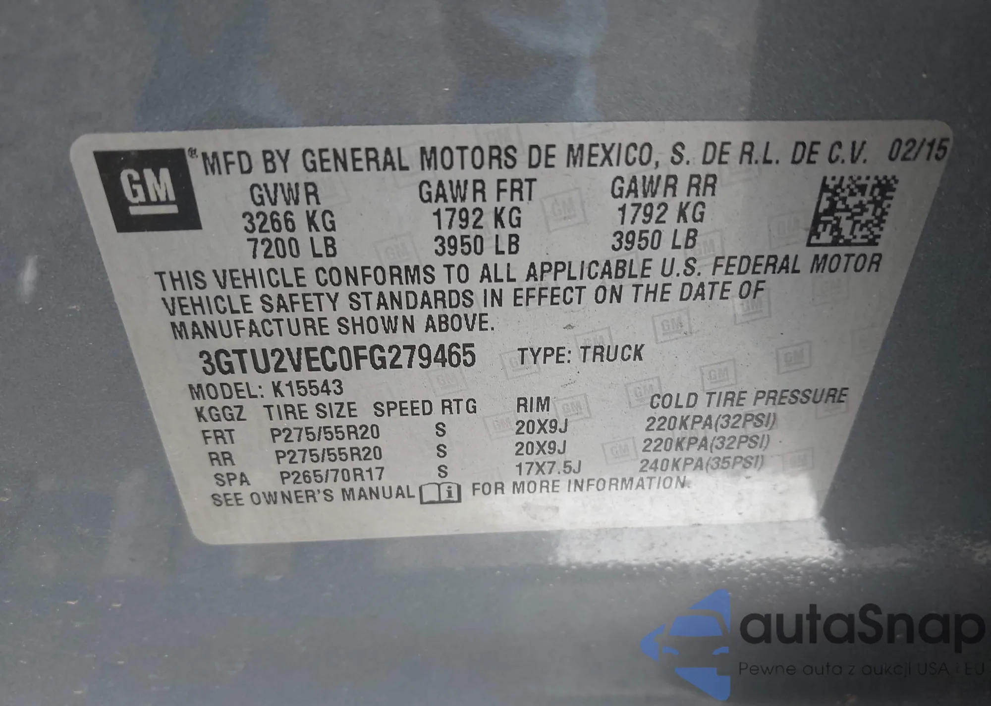 Samochód GMC Sierra 2015 (VIN 3GTU2VEC0FG279465) nie był wcześniej licytowany. Dokumenty są czyste, przebieg odpowiada lub jest niższy niż średnia rynku. Sprzedaje go firma ubezpieczeniowa – polecamy zakup. Dostawa do portu zajmie ok. 6–8 tygodni.