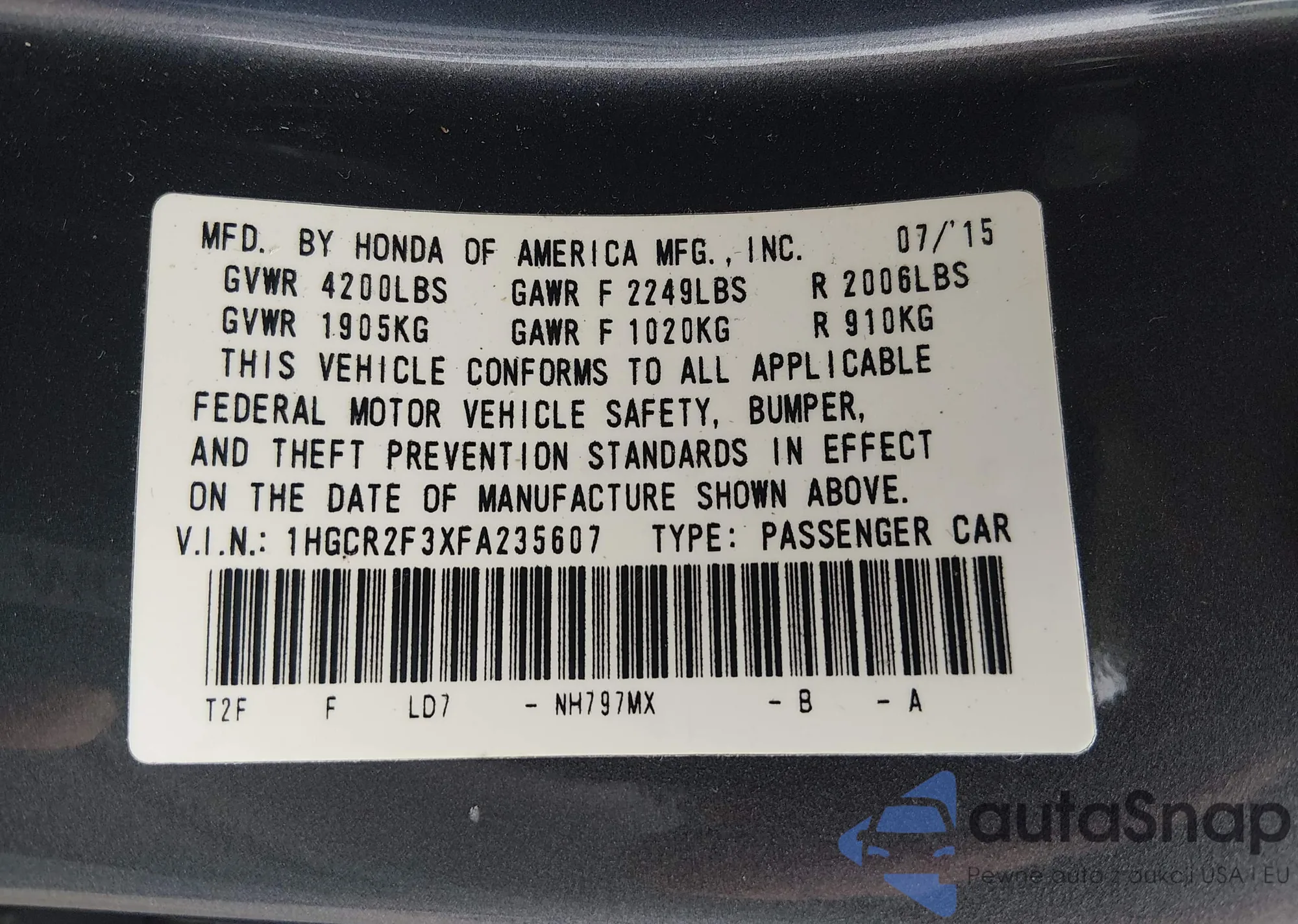Samochód Honda Accord 2015 (VIN 1HGCR2F3XFA235607) nie był wcześniej licytowany. Dokumenty są czyste, przebieg odpowiada lub jest niższy niż średnia rynku. Sprzedaje go firma ubezpieczeniowa – polecamy zakup. Dostawa do portu zajmie ok. 6–8 tygodni.