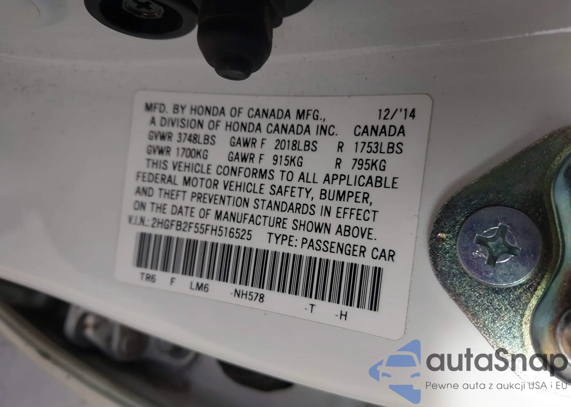 Samochód Honda Civic 2015 (VIN 2HGFB2F55FH516525) sprzedaje go niezweryfikowany sprzedawca. Zalecamy raport Carfax i potwierdzenie możliwości rejestracji pojazdu przed zakupem.