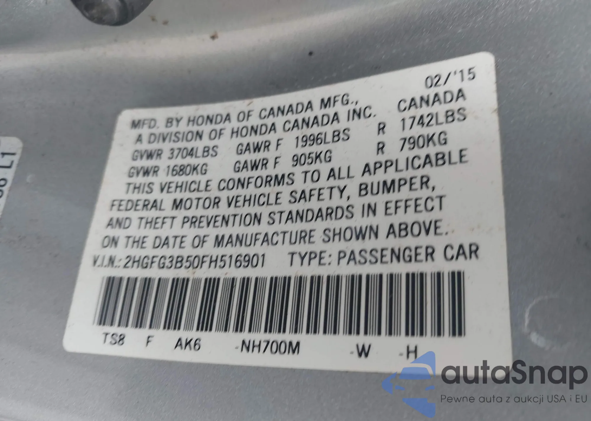 VIN: 2HGFG3B50FH516901