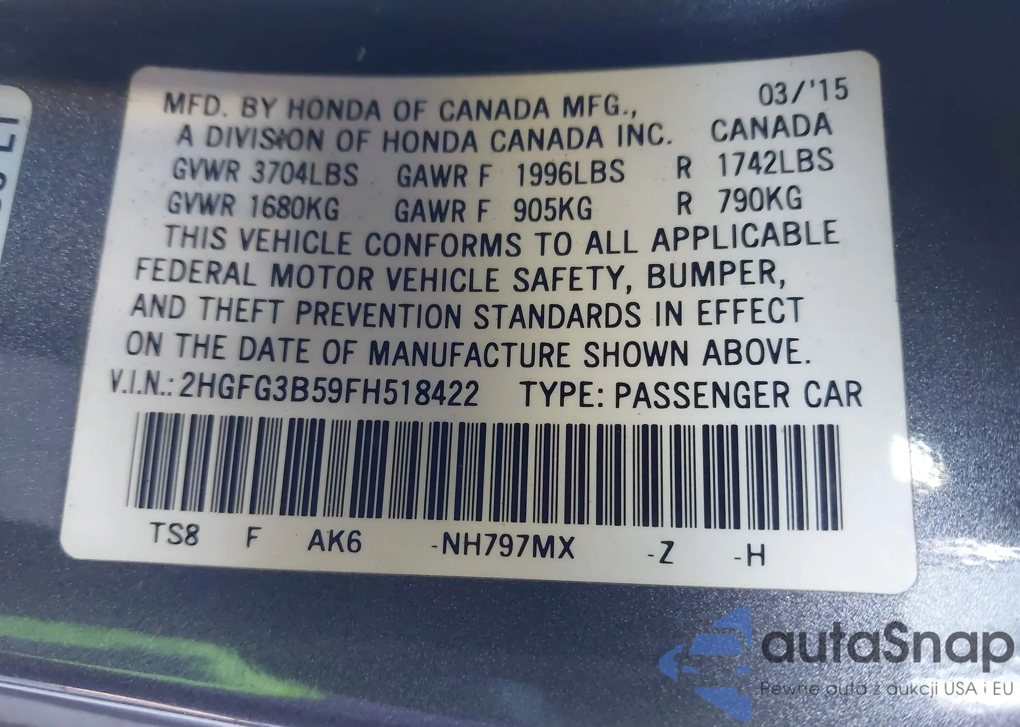 VIN: 2HGFG3B59FH518422