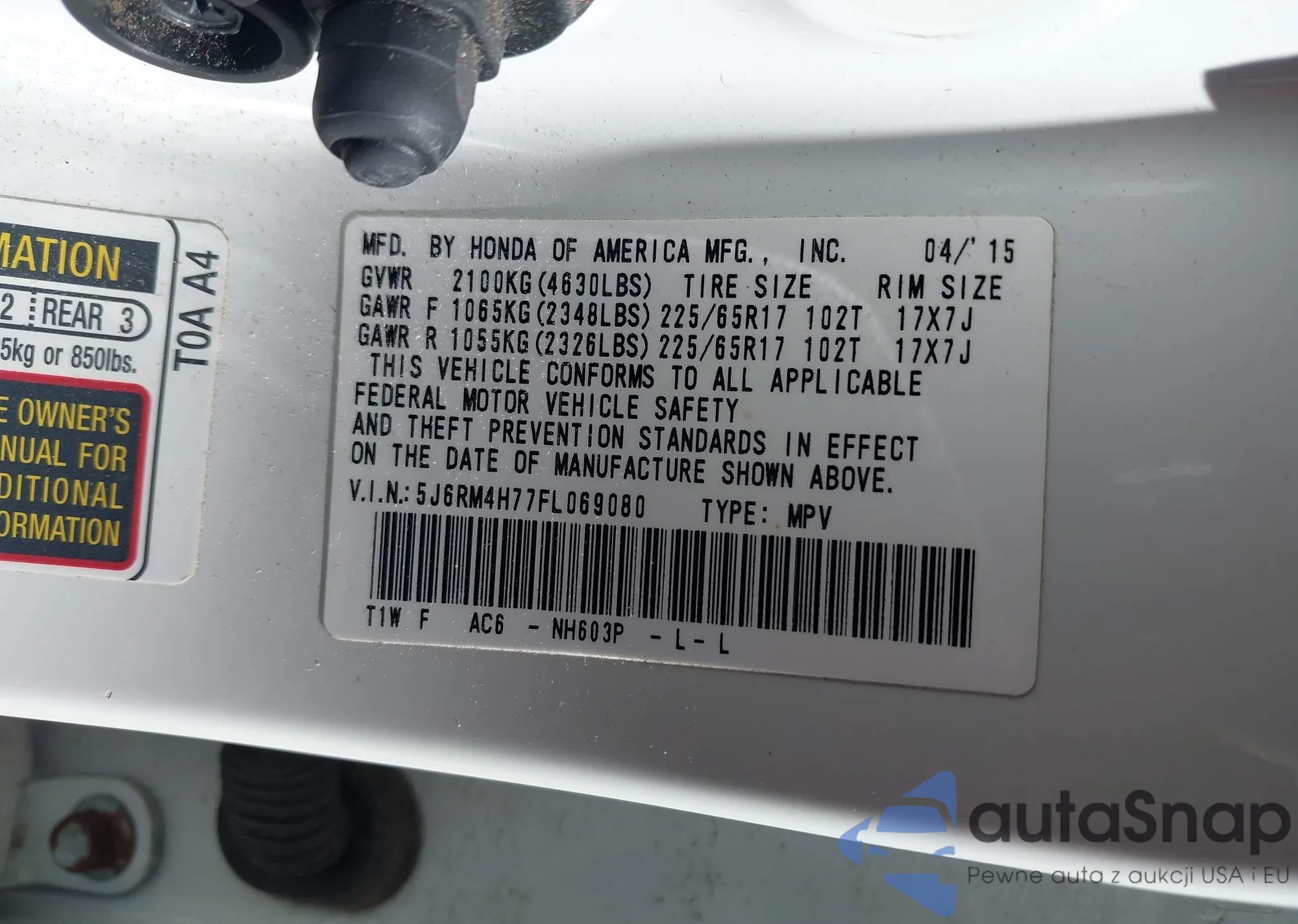 • VIN: 5J6RM4H77FL069080