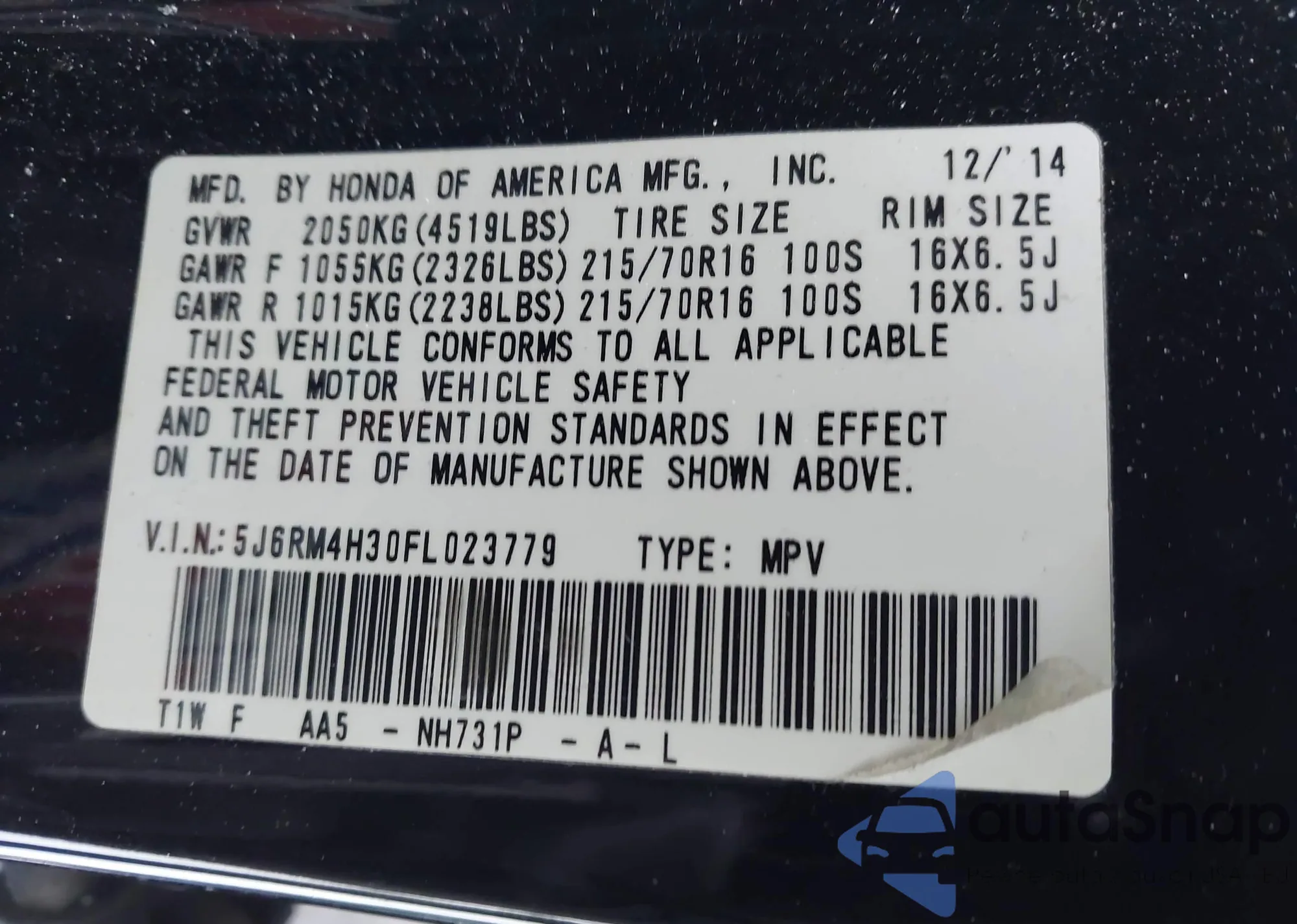 VIN: 5J6RM4H30FL023779